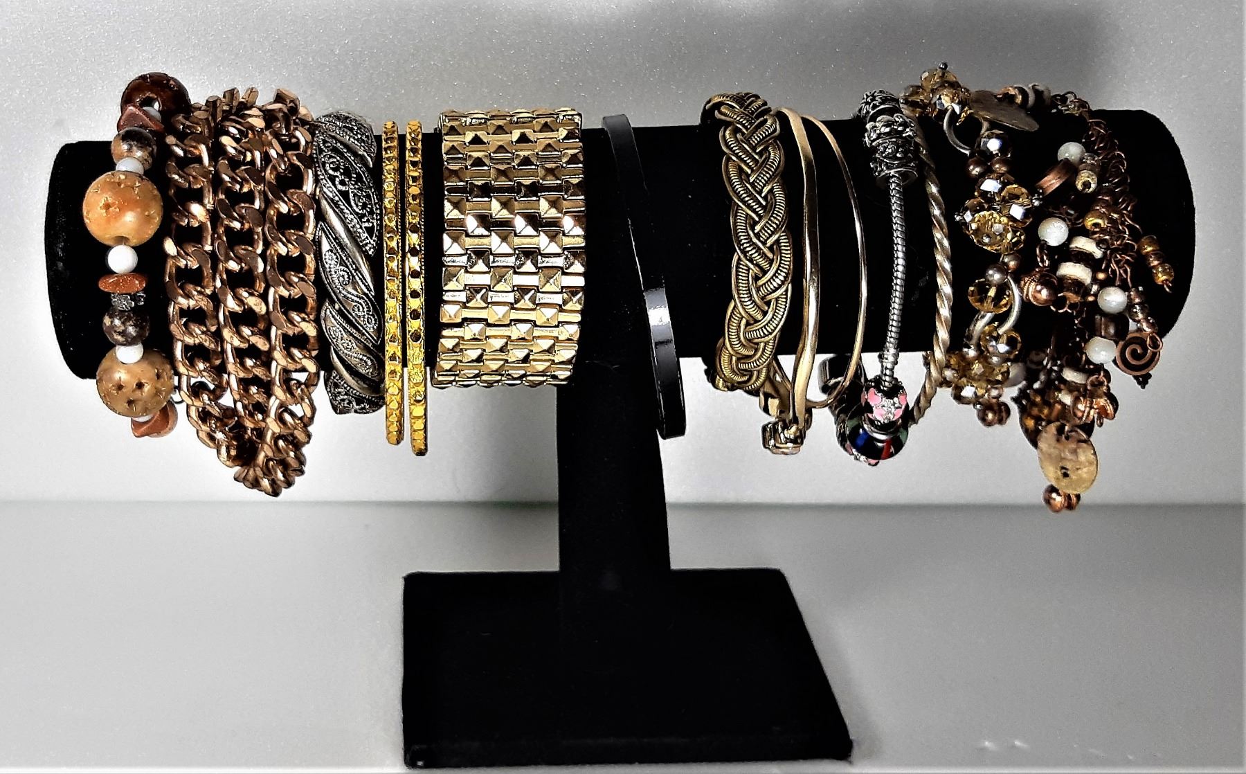 INCLUDES GOLD TONE WITH AURORA BOREALUS RHINESTONES, BLACK ENAMEL BANGLE, BRAIDED COPPER, PANDORA STYLE, ETC. JEWELRY
