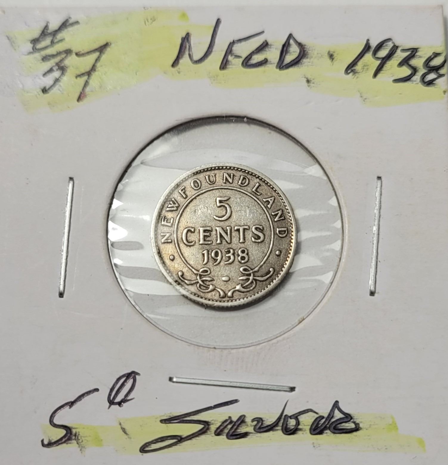 15) NEWFOUNDLAND 1938, 92.5% SILVER, 5 CENT COIN.