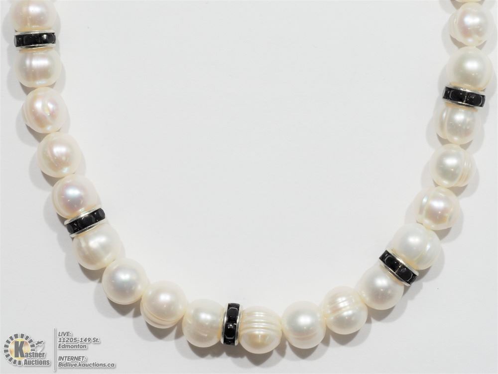 15 - GS86- STERLING SILVER FRESHWATER PEARL AND BLACK CRYSTAL NECKLACE W/COA. SUGGESTED REPLACEMENT VALUE $801.00. JEWELLERY.