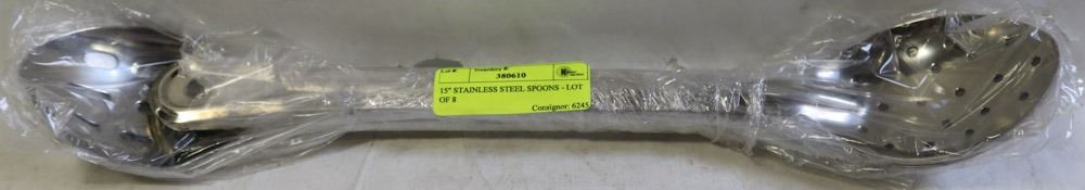 NEW, 4 - 15" STAINLESS SLOTTED SPOONS, 4 - 15" STAINLESS PERFORATED SPOONS (8 SPOONS PER LOT) - AS THEY COME IN CATALOGUE ORDER