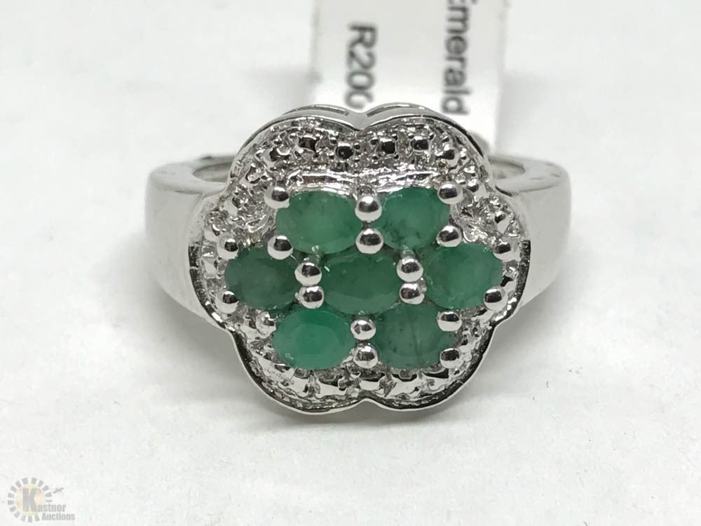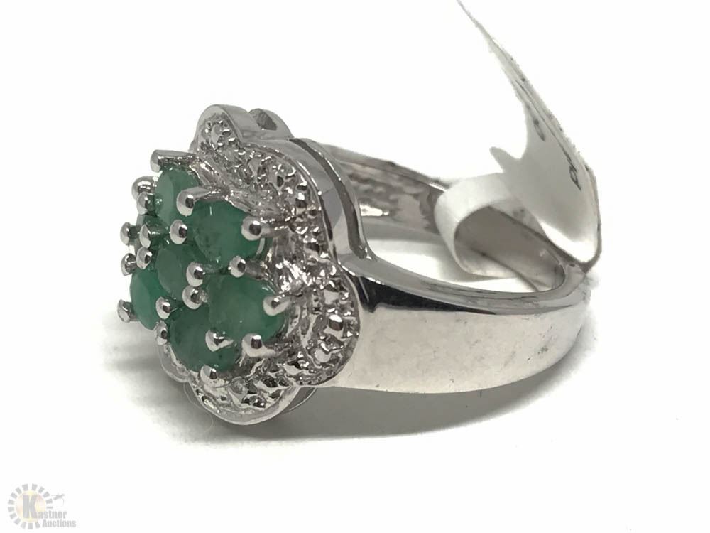 STERLING SILVER EMERALD(0.75CT) FLORAL PATTERN RING. WITH COA - SUGGESTED REPLACEMENT VALUE $575.00