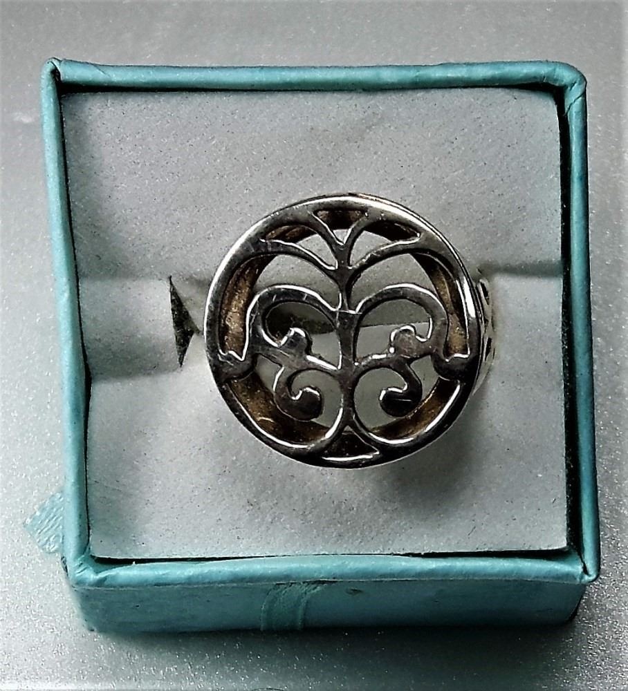 OPEN WORK RING. SIZE 7, RING FEATURES BOTH OPEN WORK ON THE TOP & THE SHOULDERS OF THE RING. JEWELRY