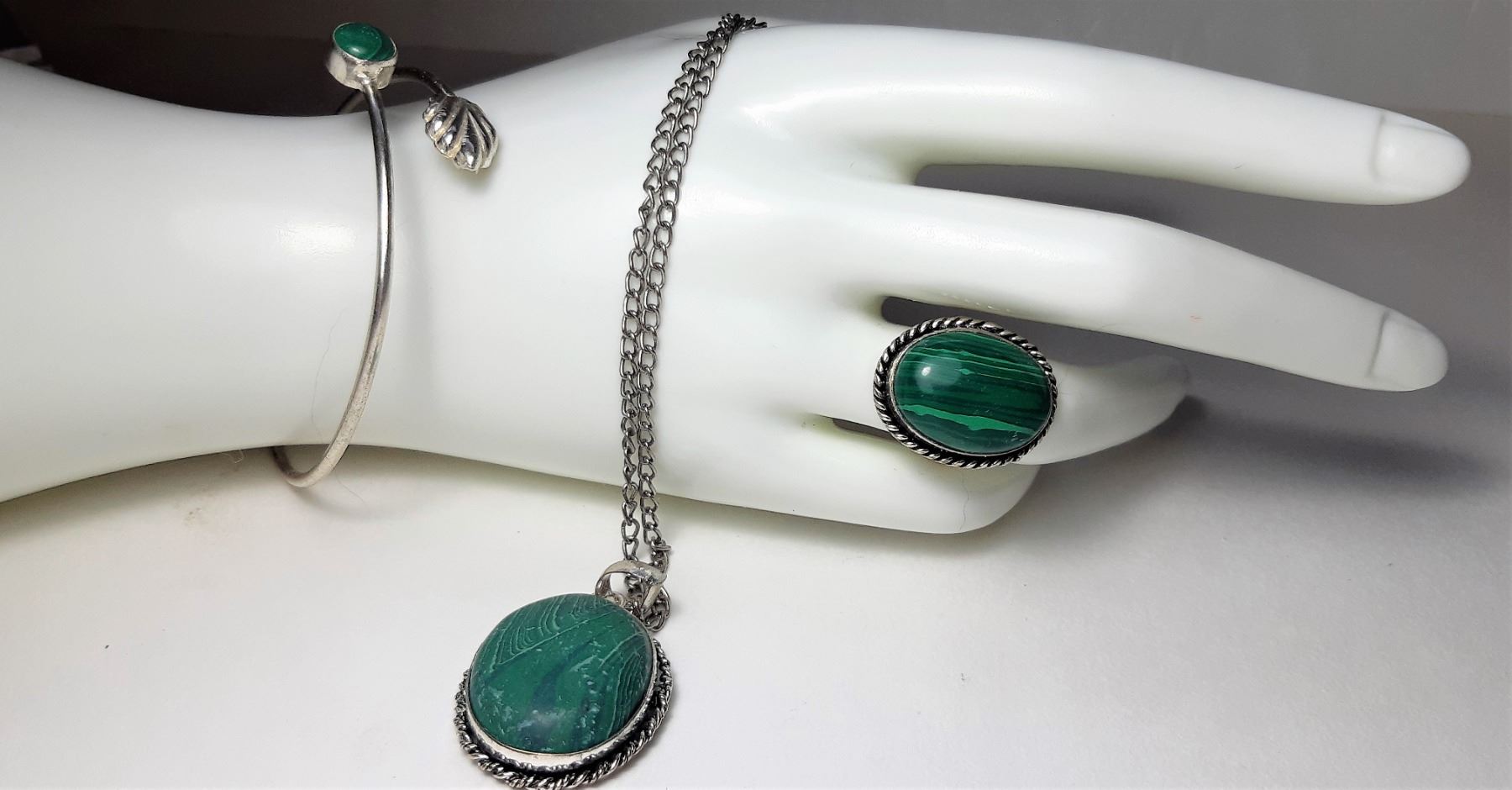 925 STAMPED SILVER JEWELRY INCLUDES: OVAL RING, SIZE 7.5, PENDANT ON CHAIN AND BANGLE BRACELET WITH LEAF ACCENT. JEWELRY