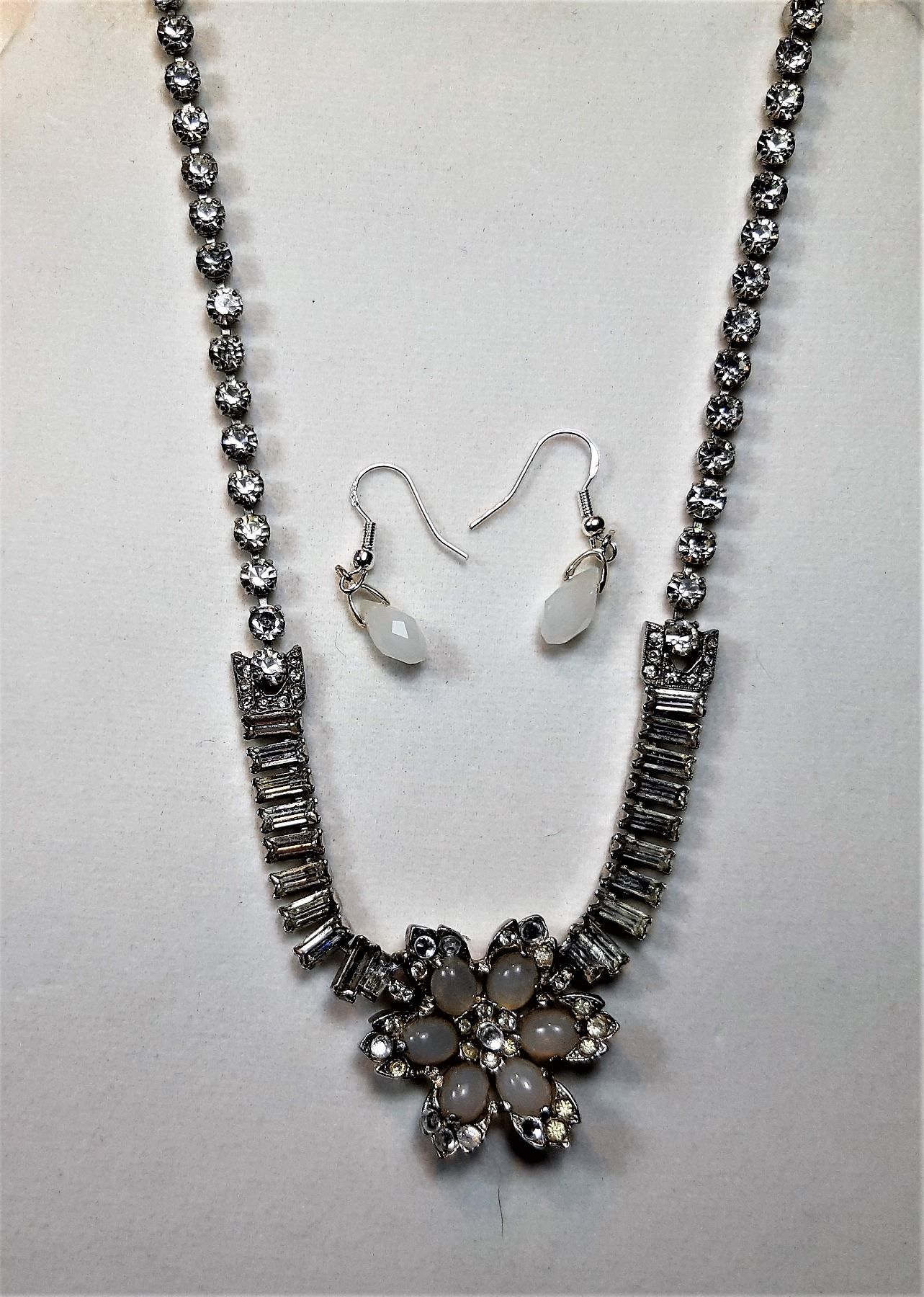 MOONSTONE FLOWER NECKLACE & COORDINATING SWAROVSKI CRYSTAL DROP EARRINGS. JEWELRY