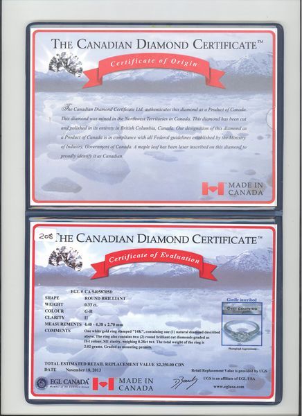 1=.33cts. ROUND BRILLIANT CUT DIAMOND, I1 CLARITY, G/H COLOR, SIDE DIAMONDS 2=.28cts. T.W. SI1 CLARITY, H/I COLOR, CANADIAN, EGL CERTIFICATE, RETAIL VALUE $2,350.00