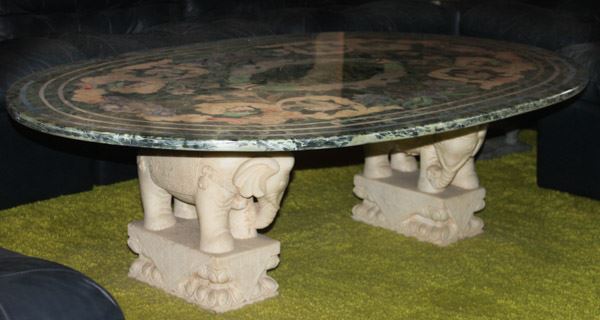 MARBLE ELEPHANT BASES. THE PROCESS CALLED "SCAGLIOLA" NAMED AFTER IT'S 15TH CENTURY INVENTOR, IS THE INLAYING OF NATURAL MARBLES IN GROUND FORM INTO CARVED DESIGNS IN MARBLE OR SLATE TOPS. MIXED WITH A SPECIAL BINDER THE POWDERS REASSUME THE COLORATIONS AND HARDINESS OF THE COLORED MARBLES FROM WHICH THEY ARE GROUND.THE "ENCAUSTO" PROCESS IS THE PAINTING OF DESIGNS ON MARBLE OR SLATE. THESE TOPS ARE IN COMBINATION OF THESE TECHNIQUES WITH INLAYS OF HARD STONE MINERALS, PROTECTED WITH POLYURETHANE. ORIGINAL COST $3000