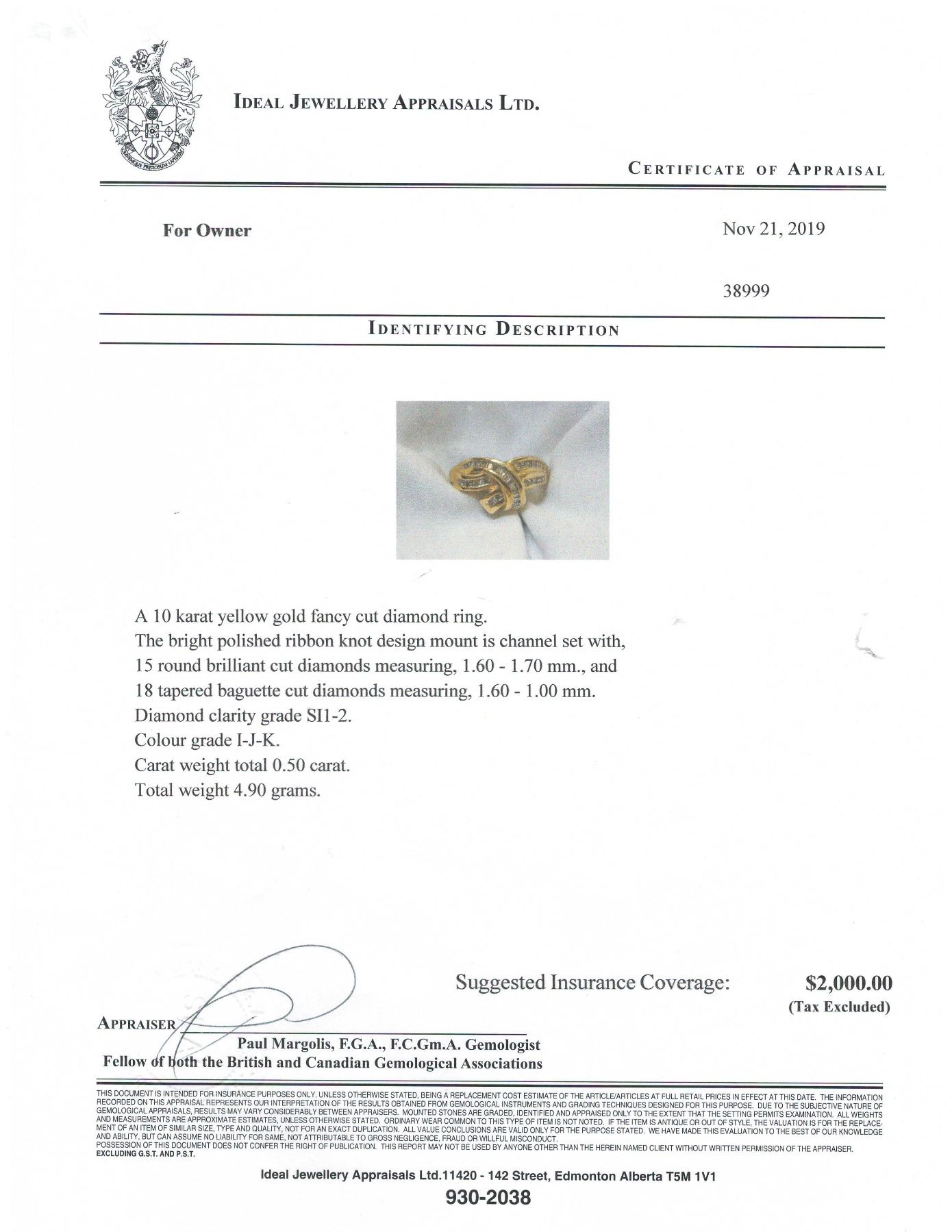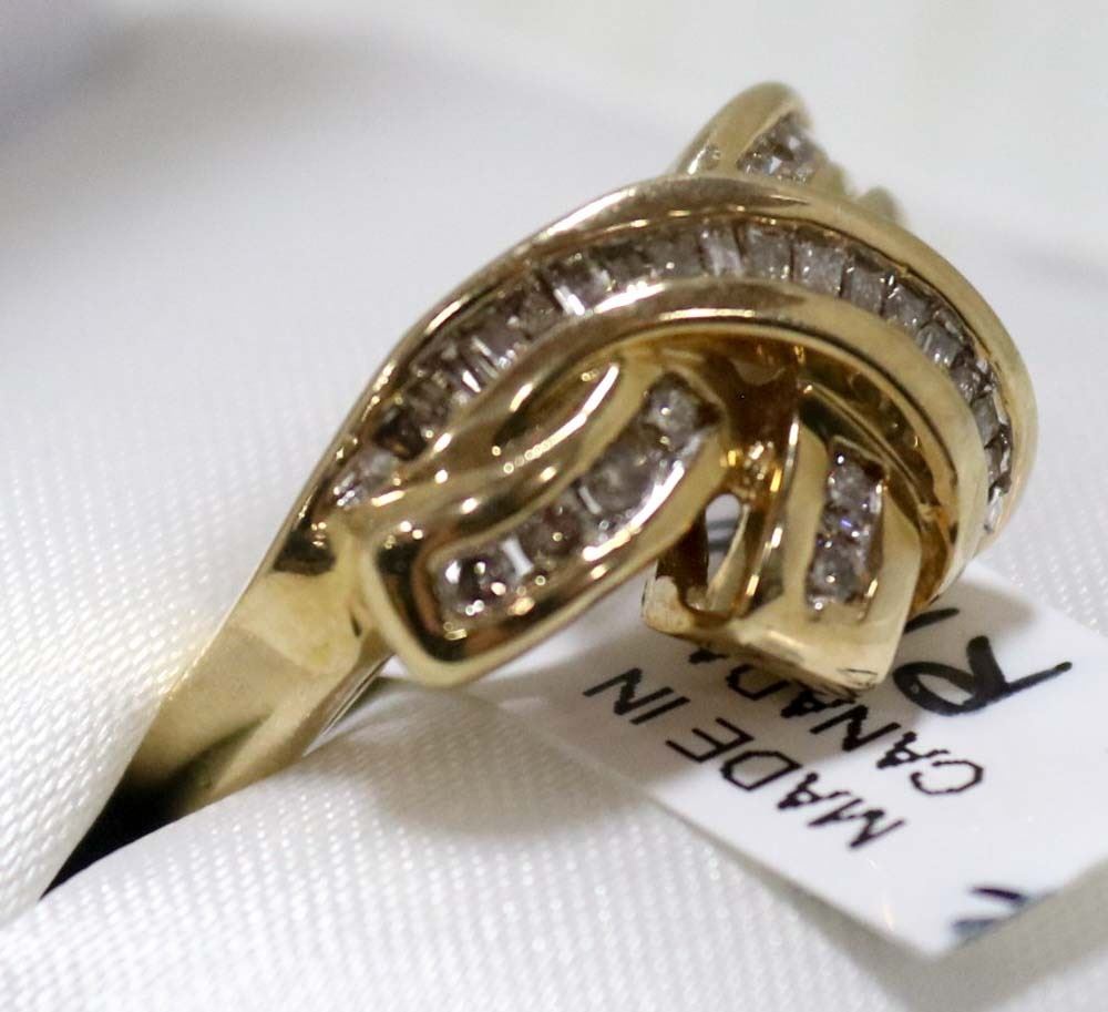 SIZE 6.25 WITH LOCAL APPRAISAL, 15 ROUND BRILLIANT CUT DIAMONDS & 18 TAPERED BAGUETTE CUT DIAMONDS, DIAMOND CLARITY GRADE SI 1-2, COLOR GRADE I-J-K, TOTAL CARAT WEIGHT 0.50 CARATS, TOTAL WEIGHT 4.90 GRAMS. SUGGESTED INSURANCE COVERAGE $2,000.00.JEWELLERY.