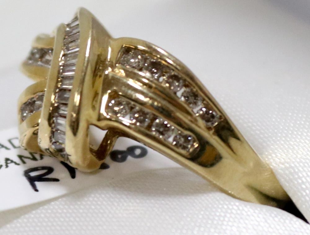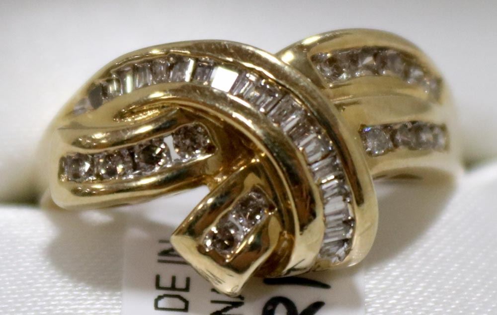 SIZE 6.25 WITH LOCAL APPRAISAL, 15 ROUND BRILLIANT CUT DIAMONDS & 18 TAPERED BAGUETTE CUT DIAMONDS, DIAMOND CLARITY GRADE SI 1-2, COLOR GRADE I-J-K, TOTAL CARAT WEIGHT 0.50 CARATS, TOTAL WEIGHT 4.90 GRAMS. SUGGESTED INSURANCE COVERAGE $2,000.00. JEWELLERY.