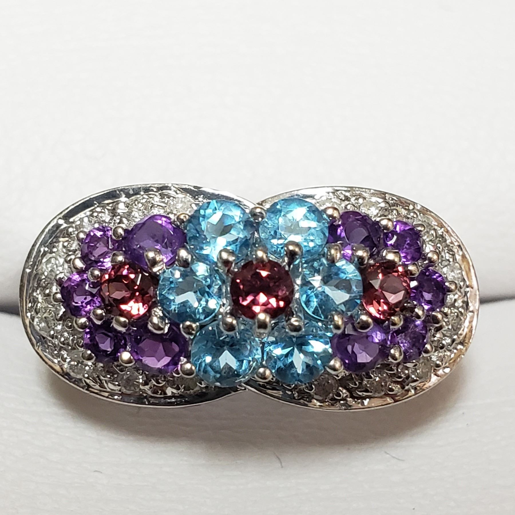 RING. SIZE 7. THE BRIGHT POLISHED TRIPLE CLUSTER AND HALO MOUNT IS PRONG SET WITH 19 IN TOTAL BLUE TOPAZ, AMETHYST AND, GARNET (WEIGHING IN TOTAL 1.25 CARATS. THE SURROUND IS BEAD SET WITH 16 ROUND BRILLIANTCUT DIAMONDS MEASURING 1.30 - 1.40 MM, CLARITY GRADE I-2, COLOR GRADE H-I, WEIGHING IN TOTAL 0.20 CARAT.) COMES WITH CERTIFICATE OF APPRAISAL FROM LOCAL APPRAISER,SUGGESTED INSURANCE COVERAGE $2200.00. JEWELLERY