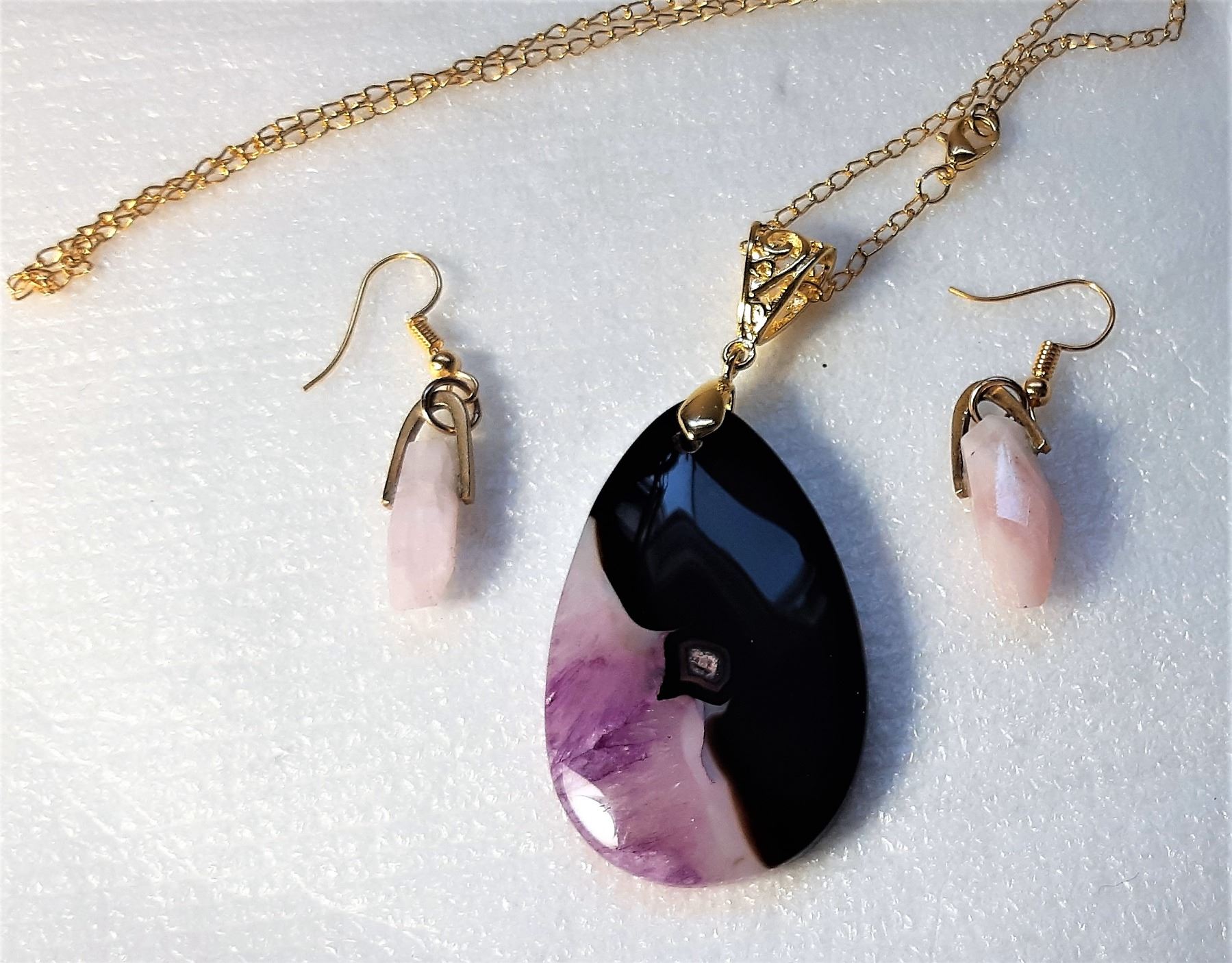 PENDANT ON 18" GOLD TONE CHAIN, MEASURING 47 X 30 X 7 MM, WITH MATCHING NATURAL ROSE QUARTZ DROP EARRINGS. JEWELRY