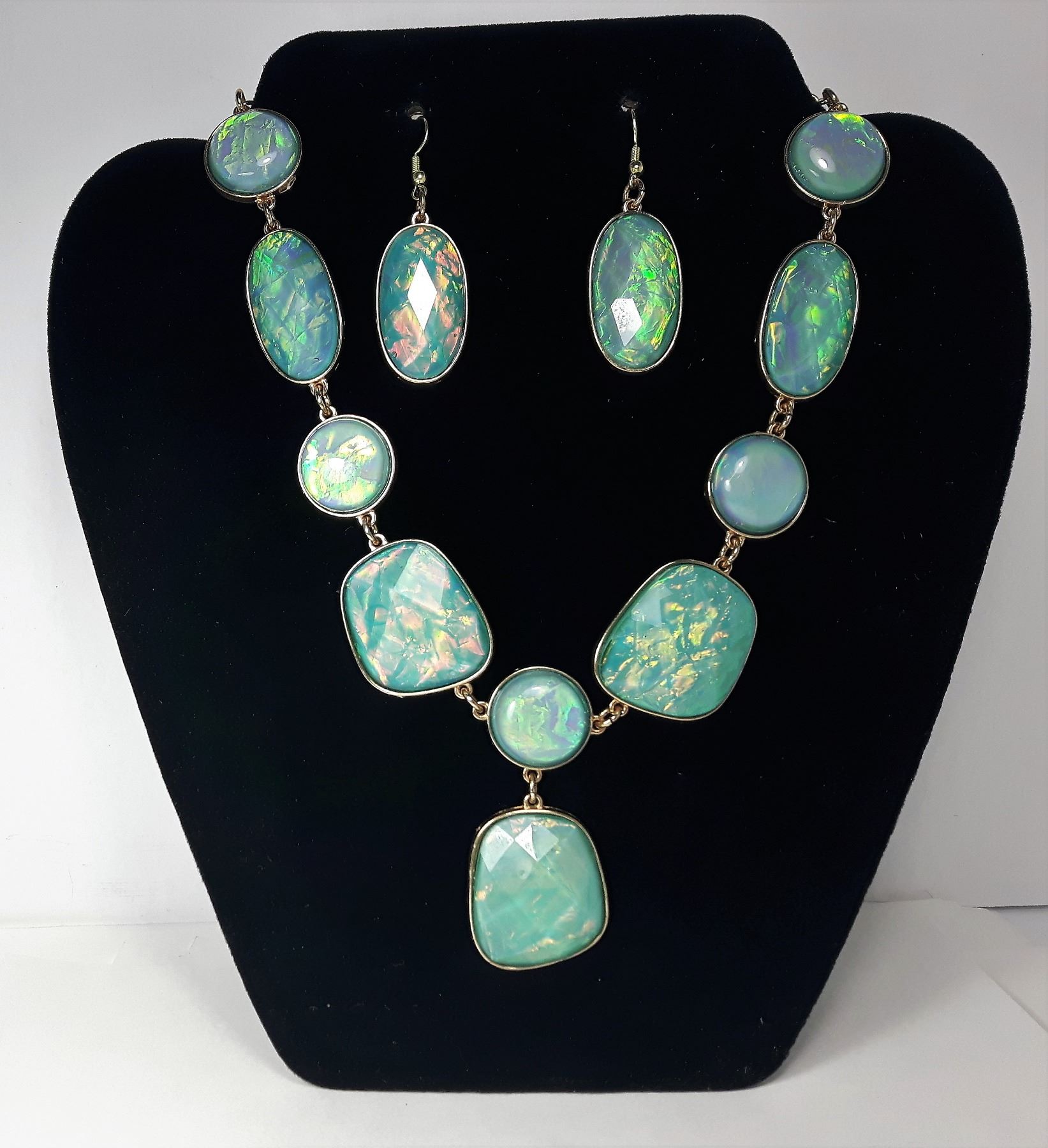 NECKLACE & EARRINGS SET. GOLD TONE SETTINGS. EARRINGS ARE LARGE OVALS & NECKLACE HAS OVAL, ROUND & FREE FORM STONES WITH A CENTRE DROP. JEWELRY