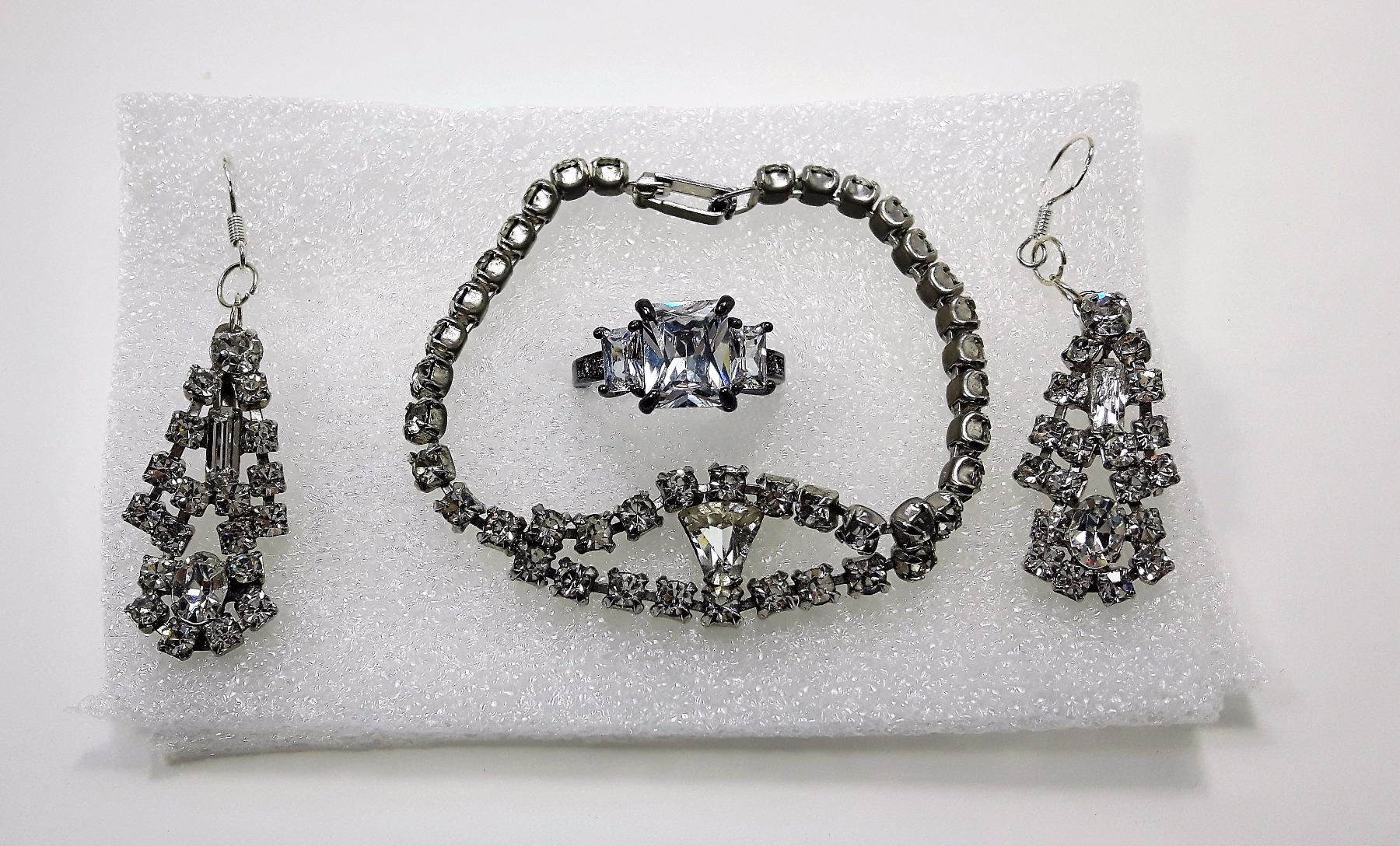 FEATURING 1950'S -1960'S RHINESTONE BRACELET & CHANDELIER EARRINGS SET ON 925 STAMPED SILVER WIRES AND 3 STONE WHITE TOPAZ RING SET IN 18K BLACK GOLD PLATE SIZE 8