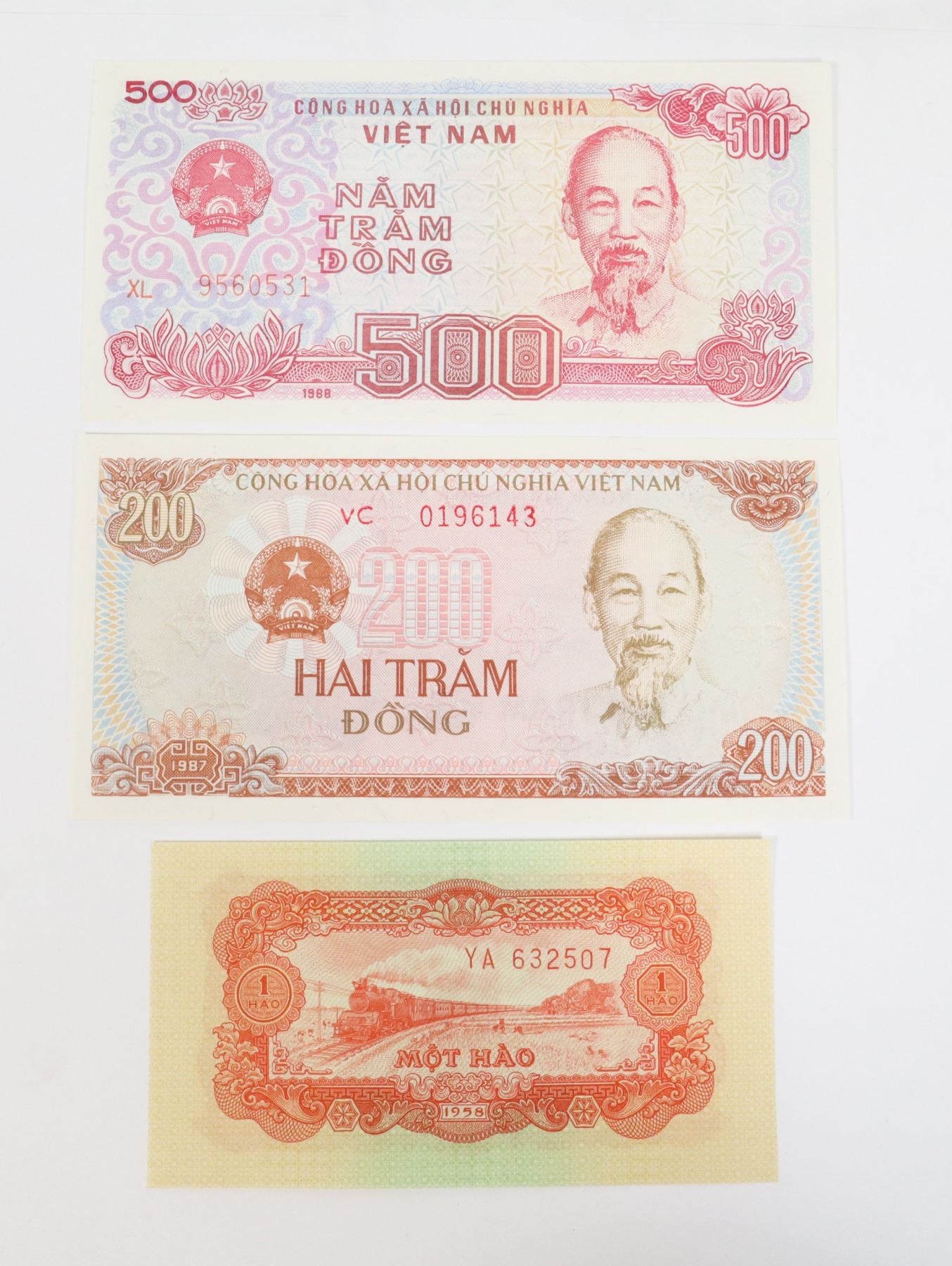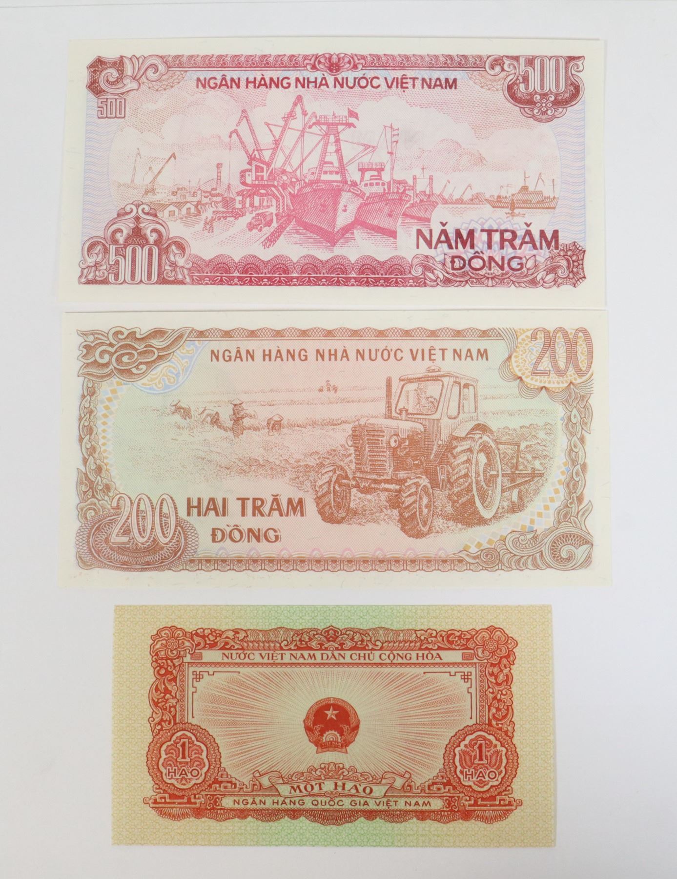 1 HAO 1958 200 DONG 1987 500 DONG 1988 HO CHI MIHN DESIGN PAPER MONEY BANKNOTE BILL LOT OF 3