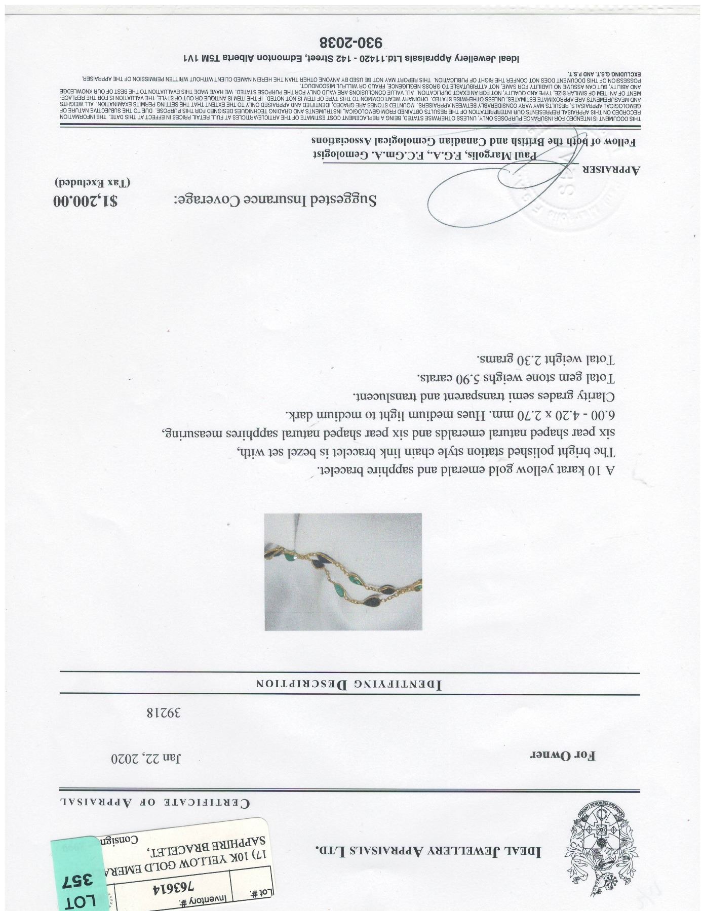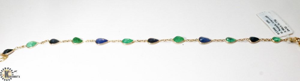 APPROX 7", SIX PEAR SHAPED NATURAL EMERALDS & SIX PEAR SHAPED NATURAL SAPPHIRES (MEASURING 6.00 - 4.20 X 2.70MM ,HUES MEDIUM LIGHT TO MEDIUM DARK, CLARITY GRADES SEMI TRANSPARTEN AND TRANSLUCENT, WEIGHS TOTAL 5.90 CARATS). COMES WITH CERTIFICATE OF APPRAISAL FROM LOCAL APPRAISER, SUGGESTED INSURANCE COVERAGE $1,200.00. JEWELLERY