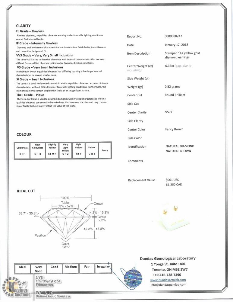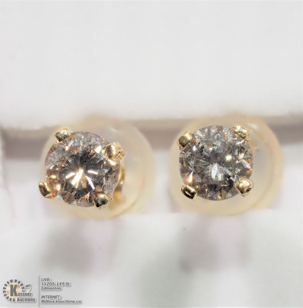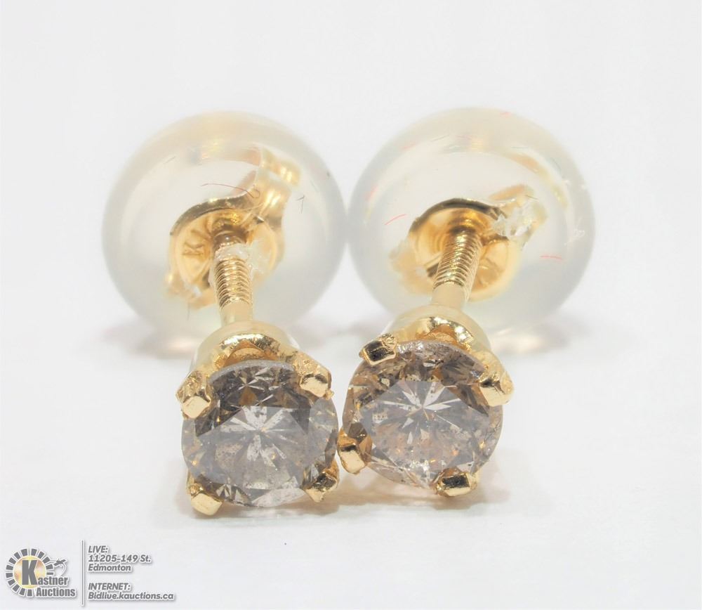 17 - MM78 - 14K YELLOW GOLD FANCY BROWN DIAMOND (0.36CT) STUD EARRINGS, W/ COA, SUGGESTED REPLACEMENT VALUE $1250.00. JEWELLERY