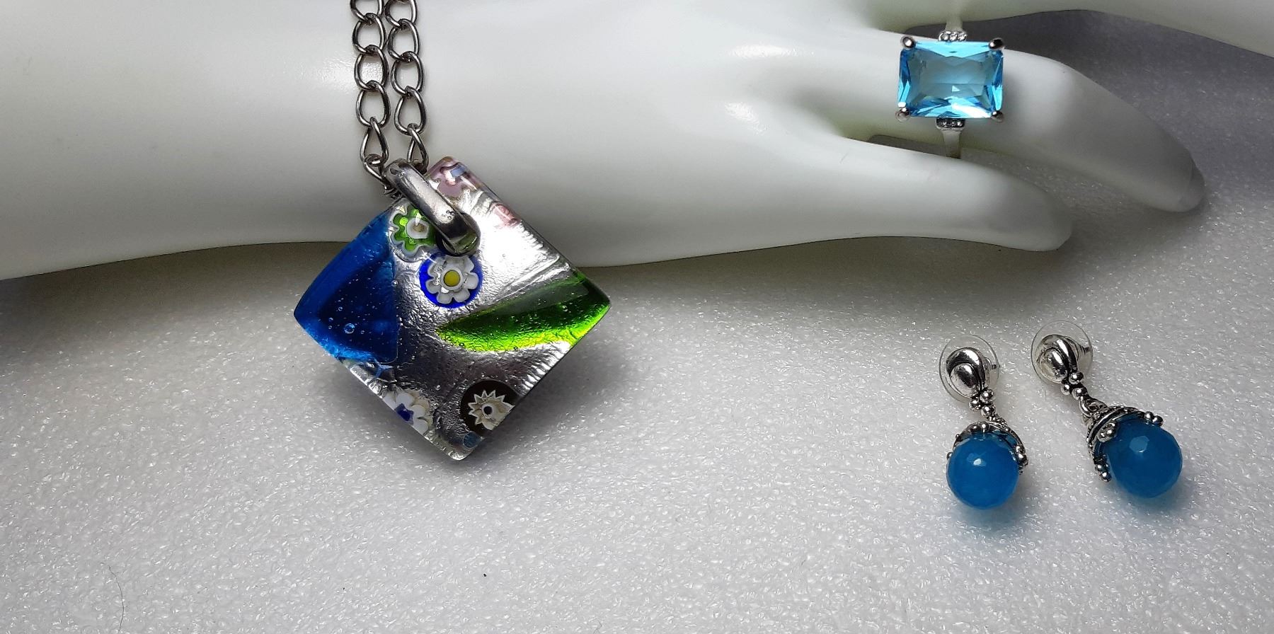 GLASS PENDANT SET ON THE DIAGONAL ON A 28" CHAIN, WITH SILVER BACKGROUND AND BLUE & GREEN, COORDINATING DROP STUD EARRINGS IN THE MATCHING BLUE AND LONDON BLUE TOPAZ CZ EMERALD CUT RING, SIZE 8. JEWELRY