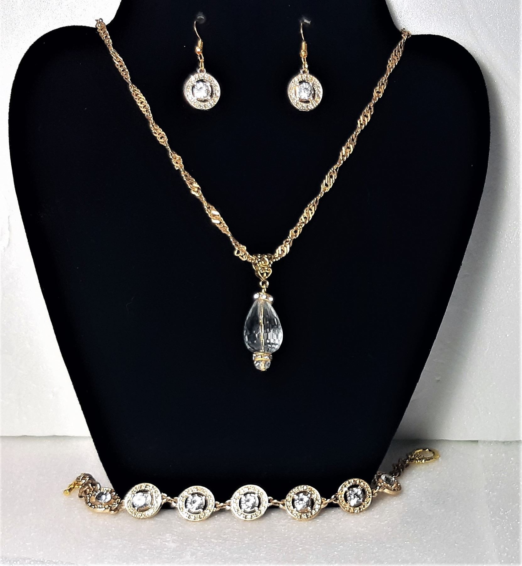 AND CLEAR CRYSTAL JEWELRY, FEATURING HEAVY 22" HERRINGBONE CHAIN WITH GOLD TONE AND CLEAR CRYSTAL TEAR DROP PENDANT, 8" BRACELET WITH TOGGLE CLOSURE AND DROP EARRINGS ON FISH HOOKS. JEWELRY