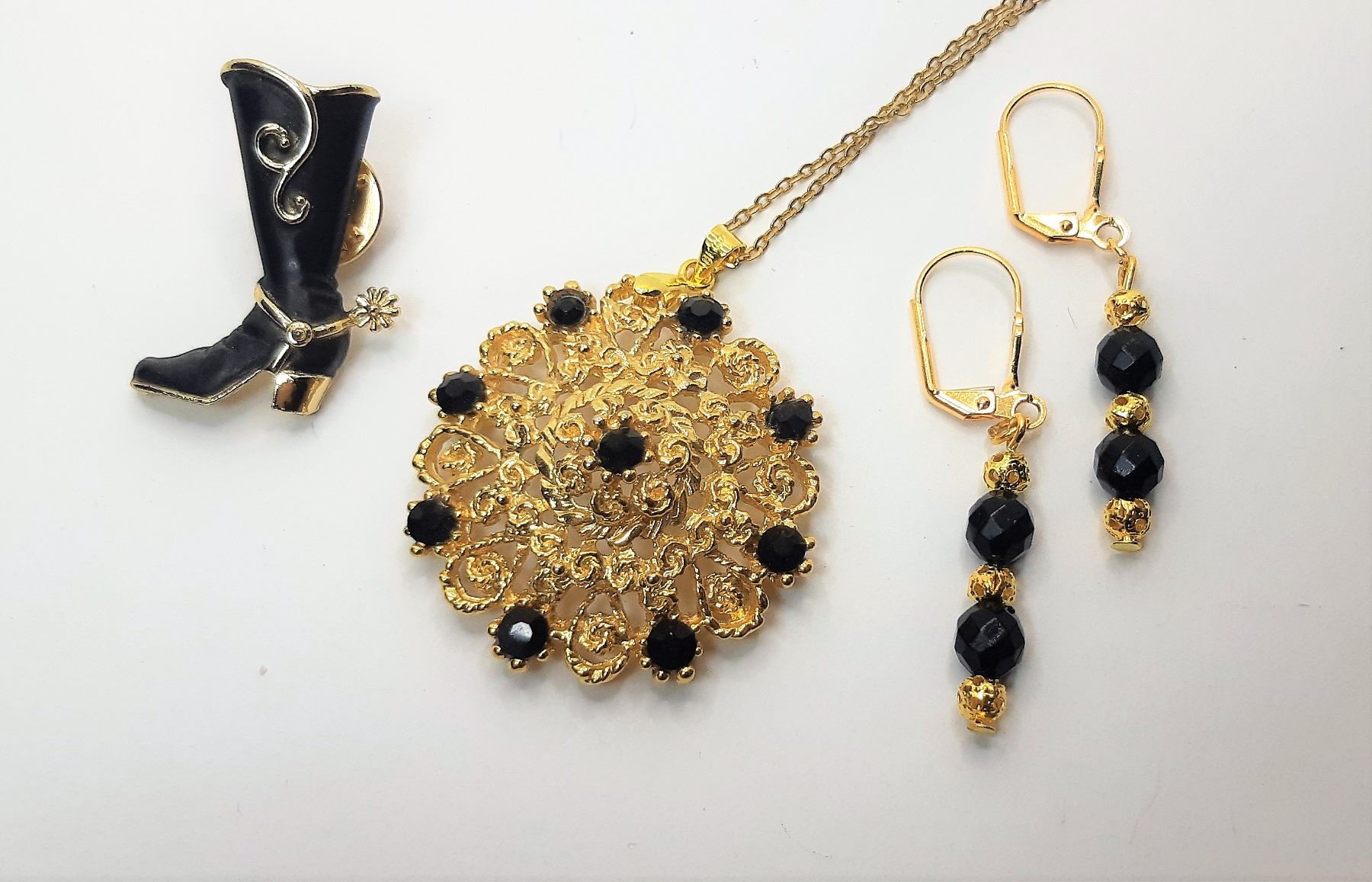 FILAGREE PENDANT, 1.5" DIAMETER, ON AN 18" CHAIN, COORDINATING DROP EARRINGS ON FRENCH LEVERBACKS AND BLACK AND GOLD ENAMEL COWBOY BOOT LAPEL PIN. JEWELRY