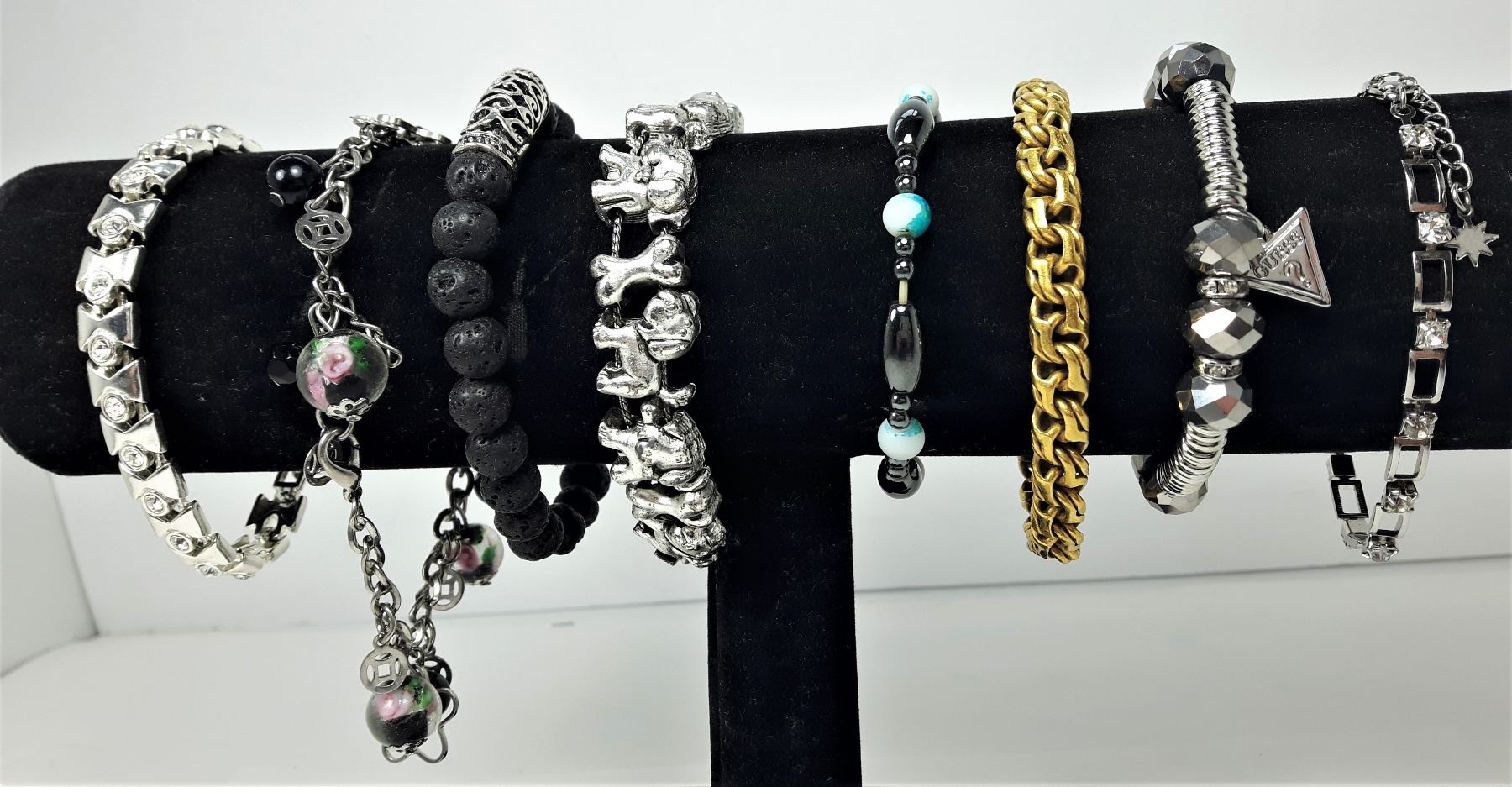 INCLUDING BLACK LAVA ROCK, SILVER TONE & CLEAR CRYSTAL, DOGS & BONES, GUESS GREY CRYSTAL, MAGNETIC, & MURANO GLASS & CHARMS. JEWELRY