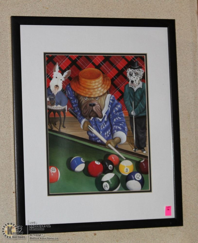 17 X 21 DOGS PLAYING POOL, FRAMED & MATTED
