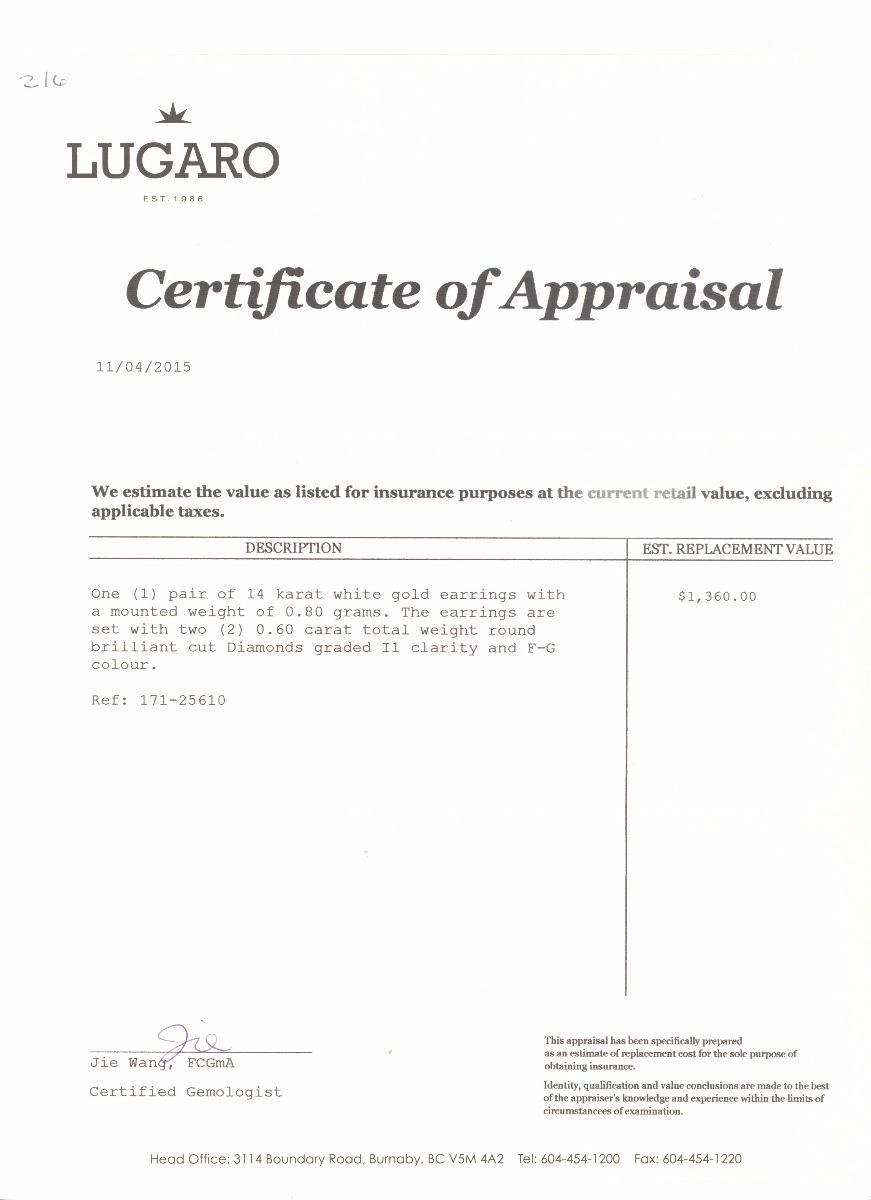 2=.60cts t.w. round brilliant cut, I1 clarity, F/G color, appraisal.