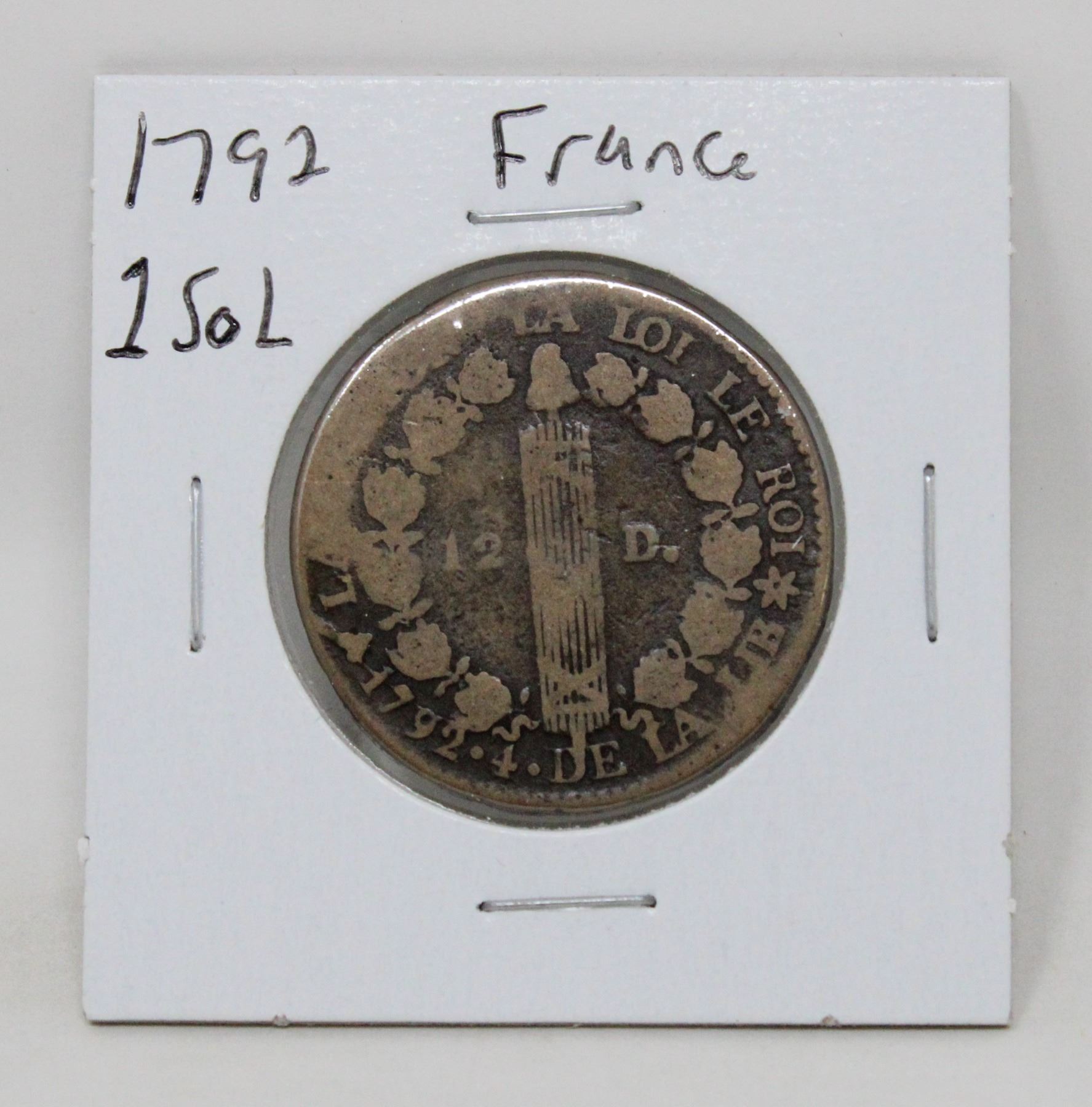 1792 FRANCE LARGE 2 SOL COIN, VG