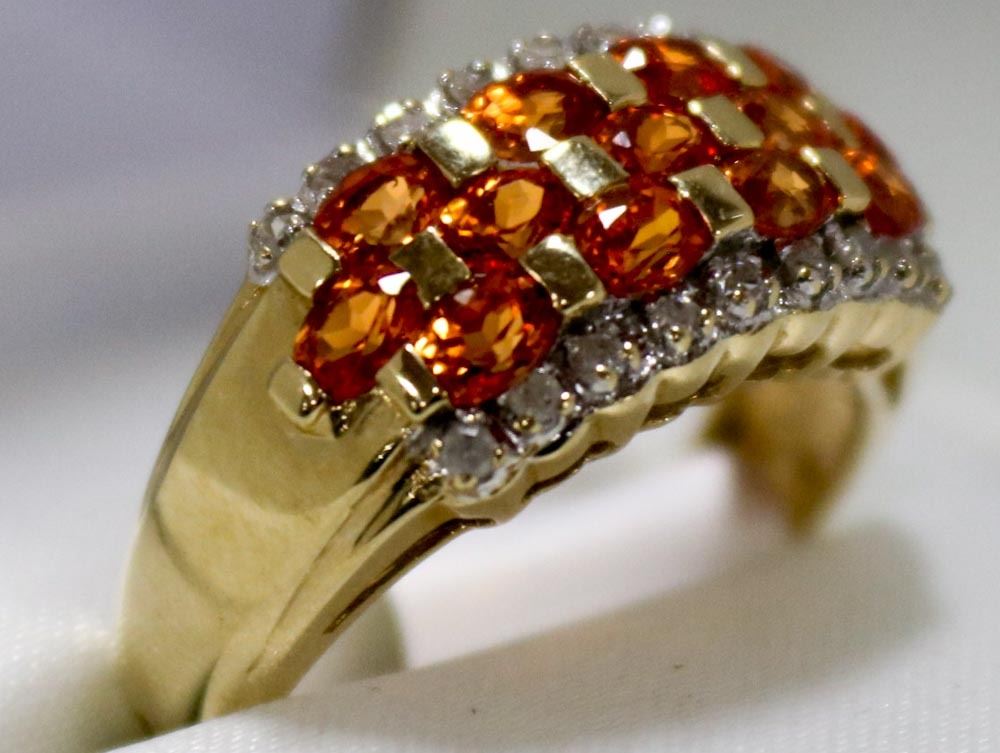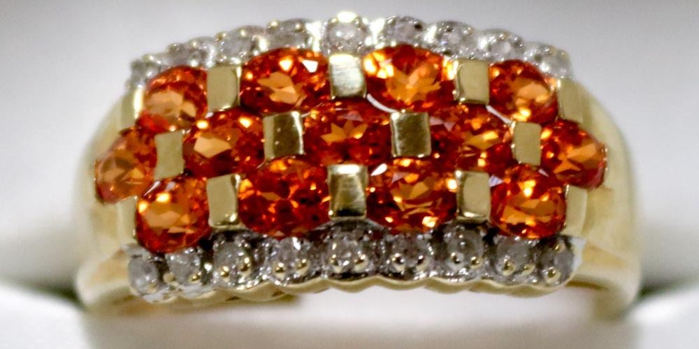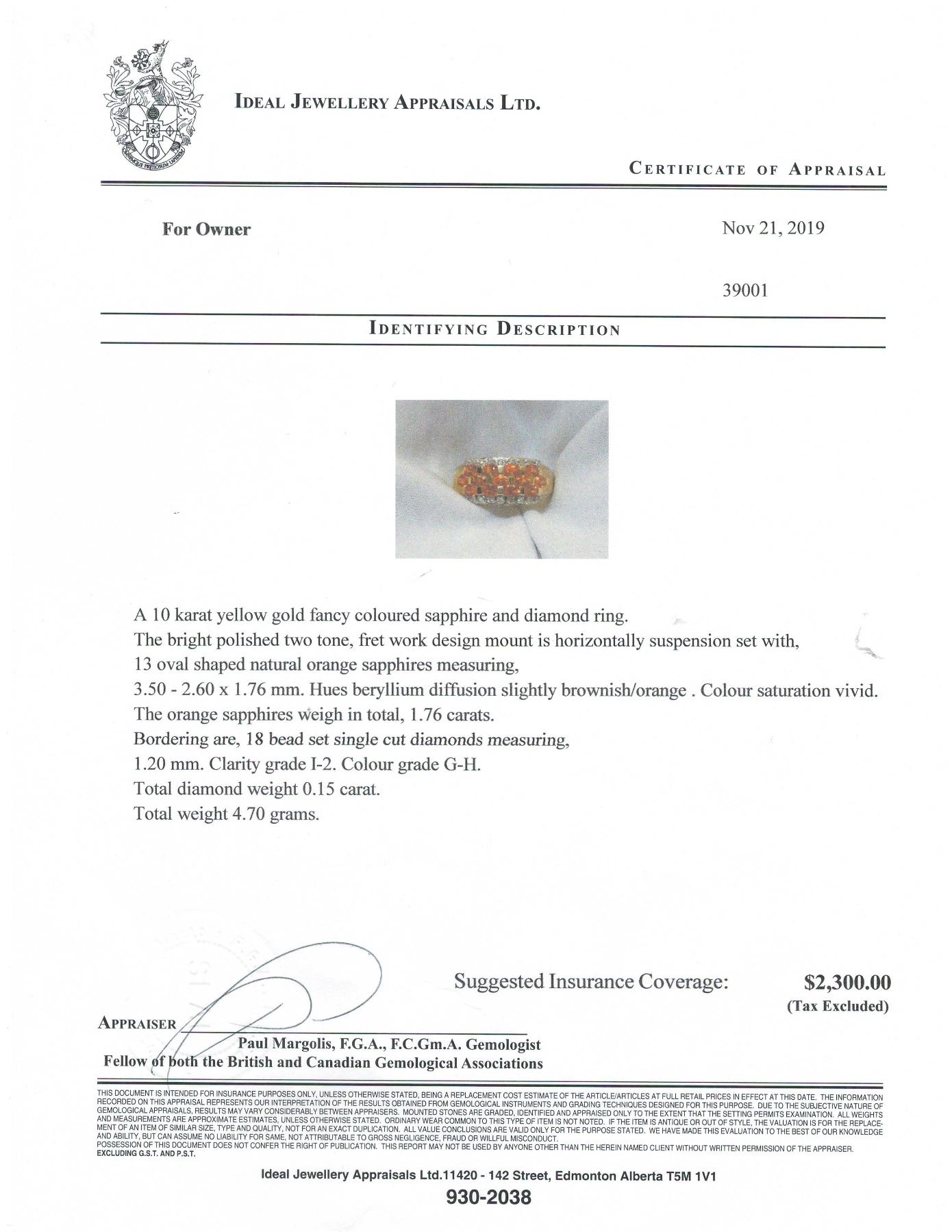 SIZE 8 WITH LOCAL APPRAISAL, 13 SAPPHIRES, CARAT WEIGHT 1.76 CARATS, 18 BEAD SET SINGLE CUT DIAMONDS, CLARITY GRADE I-2, COLOR GRADE G-H, TOTAL DIAMOND WEIGHT 0.15 CARATS, TOTAL WEIGHT 4.70 GRAMS. SUGGESTED INSURANCE COVERAGE$2,300.00. JEWELLERY