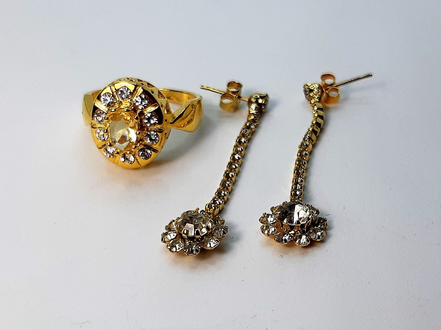 18) GOLD TONE AND CLEAR CRYSTAL RING,