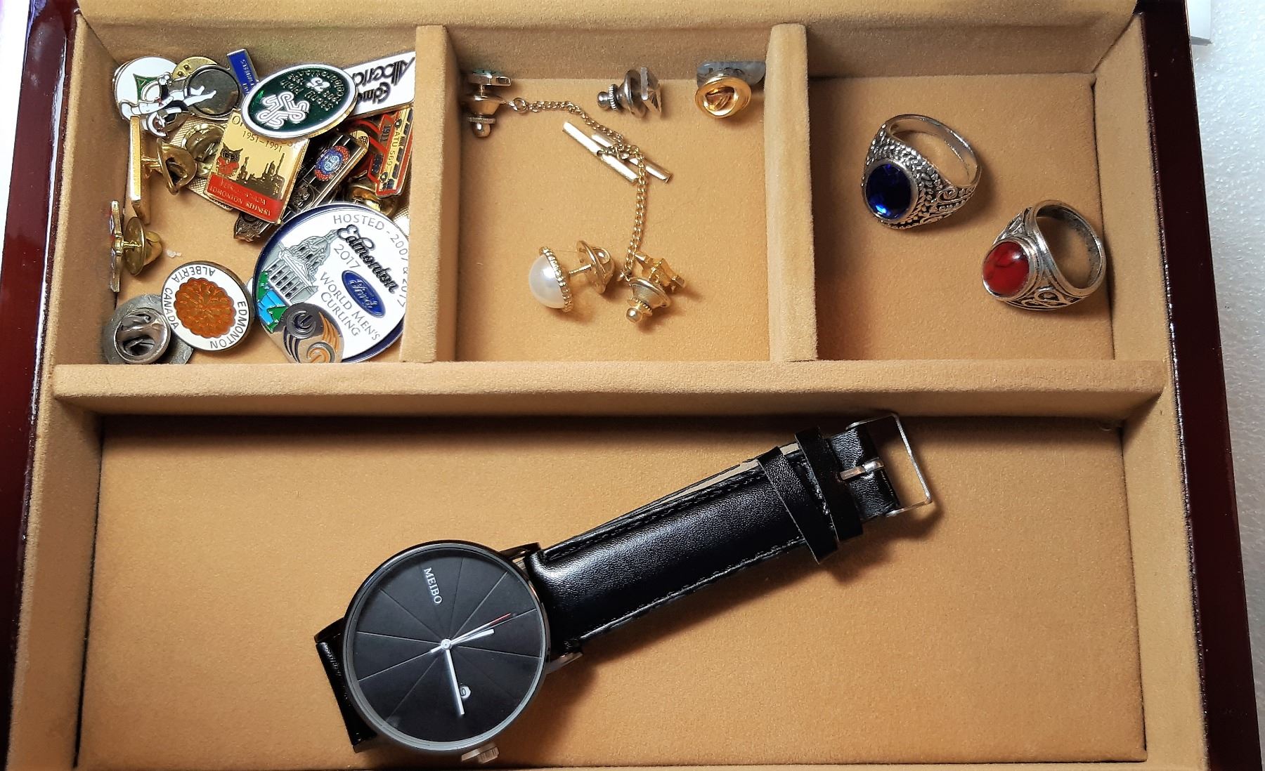 BOX WITH GOLF MOTIF, CONTAINING LAPEL PINS, TIE TACKS, RINGS AND NEW MEIBO WATCH, BOX MEASURES 9" X 6.5" X 2.5". JEWELRY
