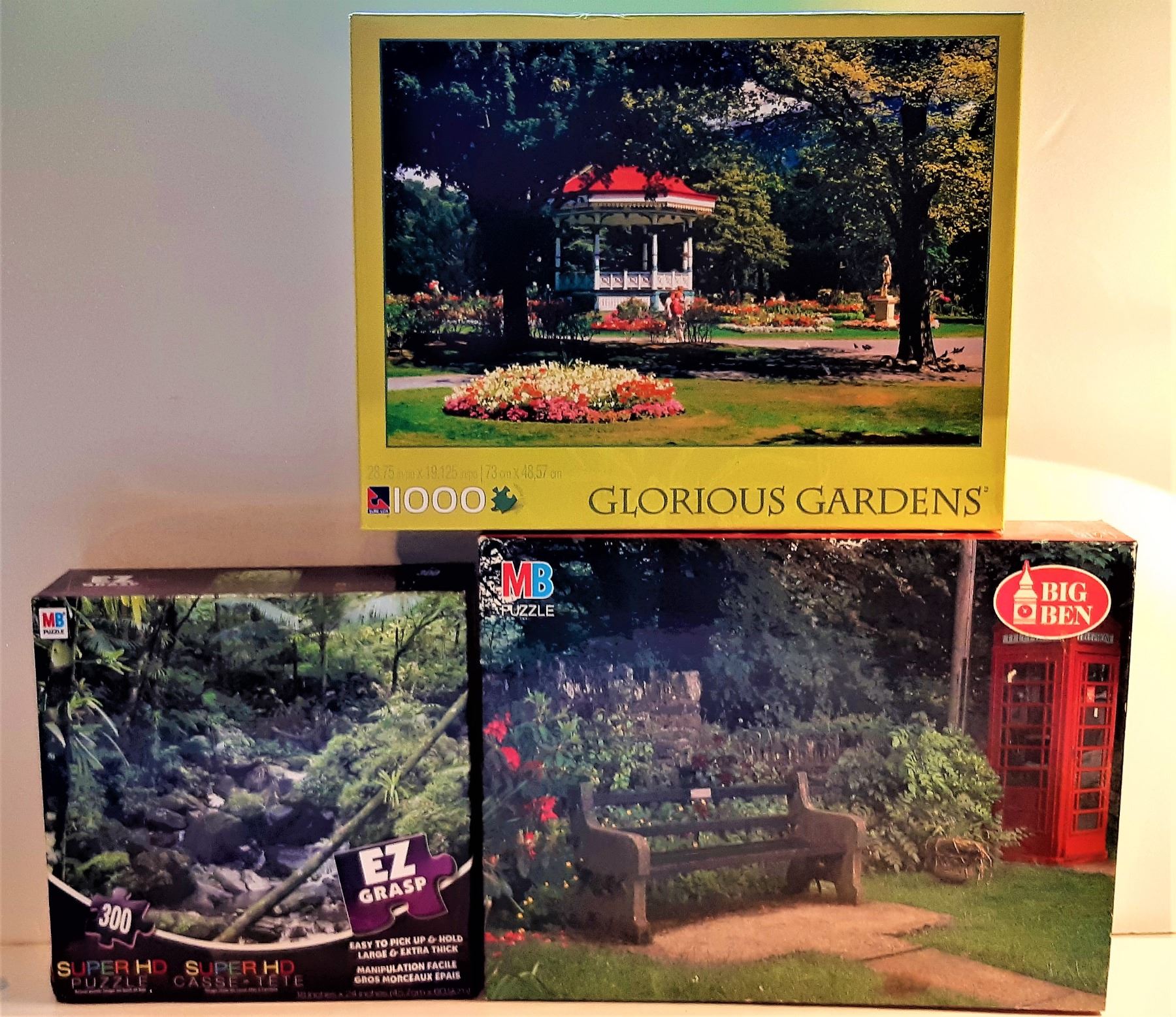 300 PCE, 18 X 24 FINISHED PRODUCT OF A STREAM AND TREES, 1000 PCE "GLORIOUS GARDENS", FINISHED PRODUCT IS 28.75 X 19.175 AND 1000 PCE PUZZLE SHOWING CORNWALL ENGLAND BENCH AND RED PHONE BOOTH. TOYS