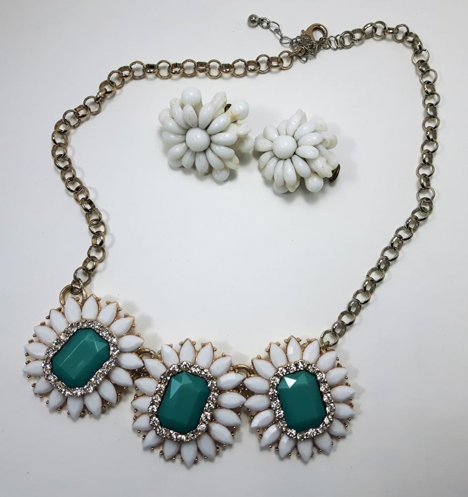 RHINESTONE & WHITE FLOWER NECKLACE WITH COORDINATING CLIP ON EARRINGS. JEWELRY