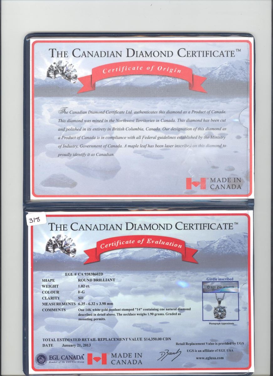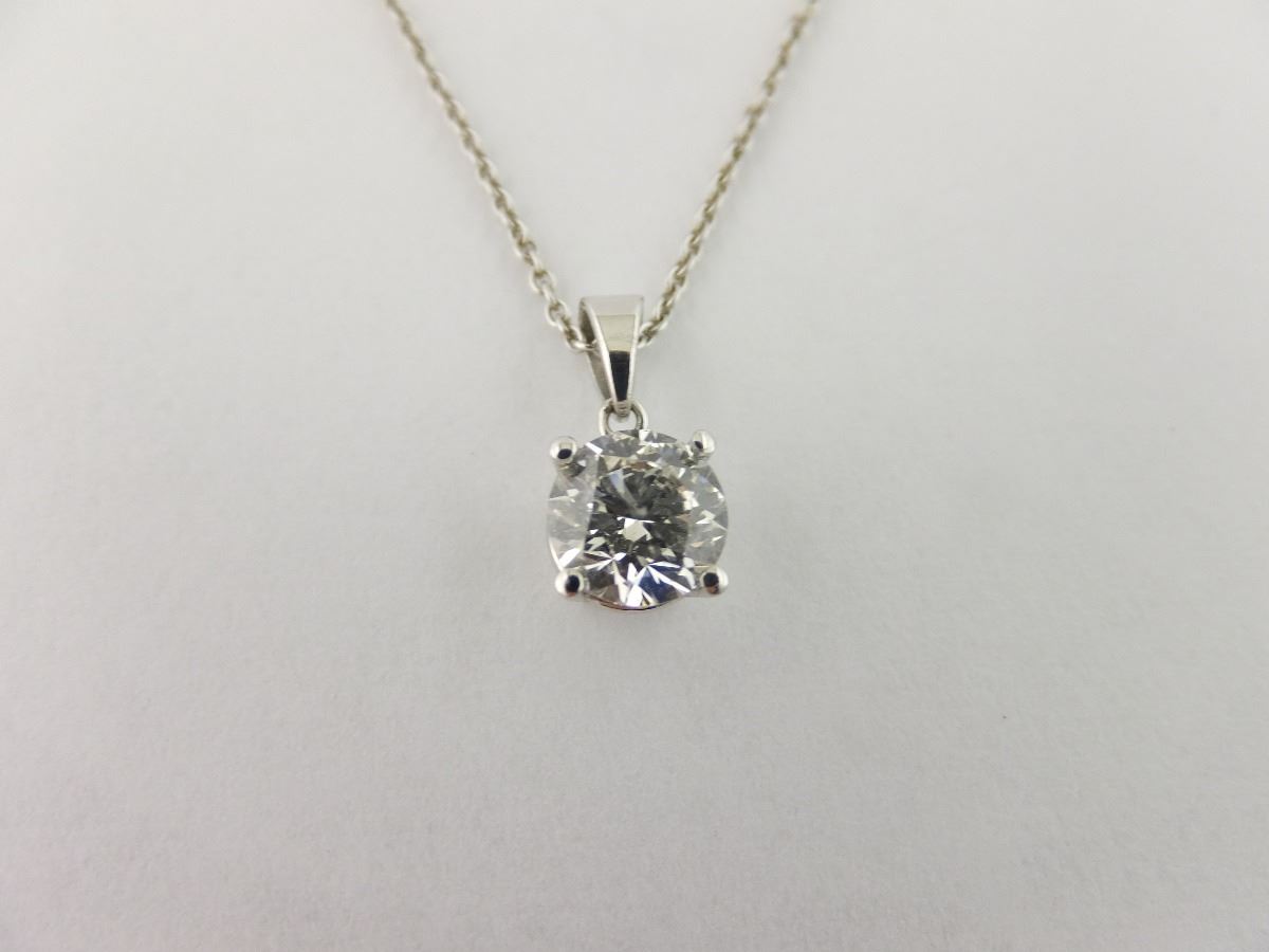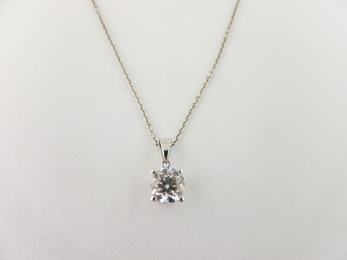 with chain, 1= 1.02cts round brilliant cut diamond, SI1 clarity, F/G color, Canadian, EGL cert. RETAIL VALUE $14,350.00