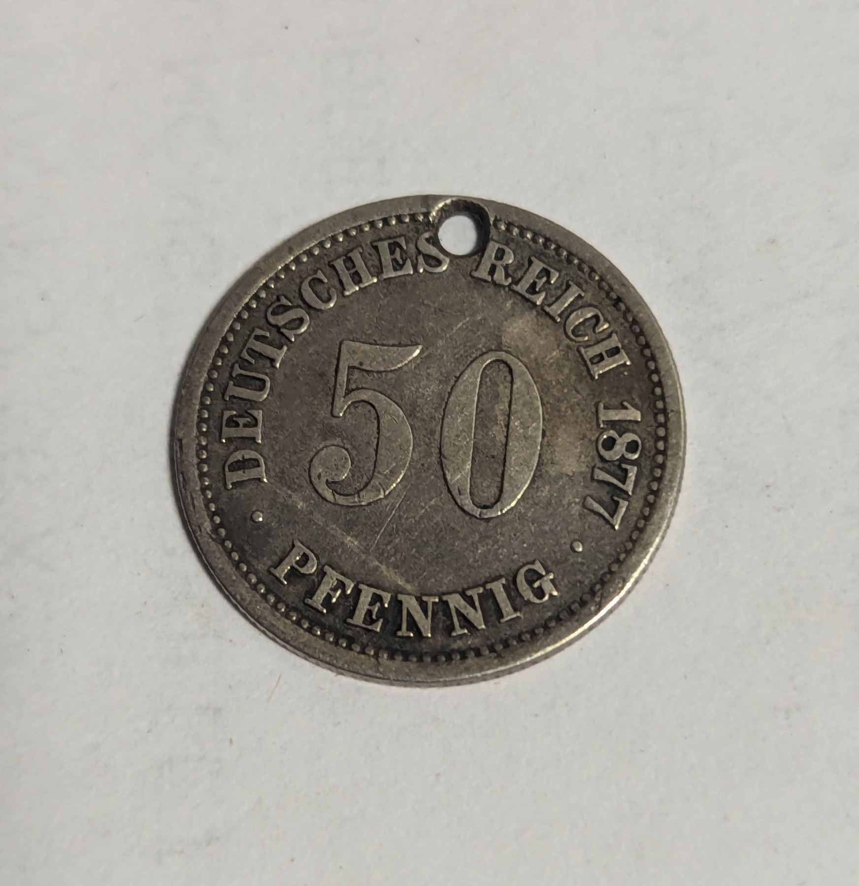 1877 SILVER PRUSSIAN 50 PFENNIG COIN, HOLED