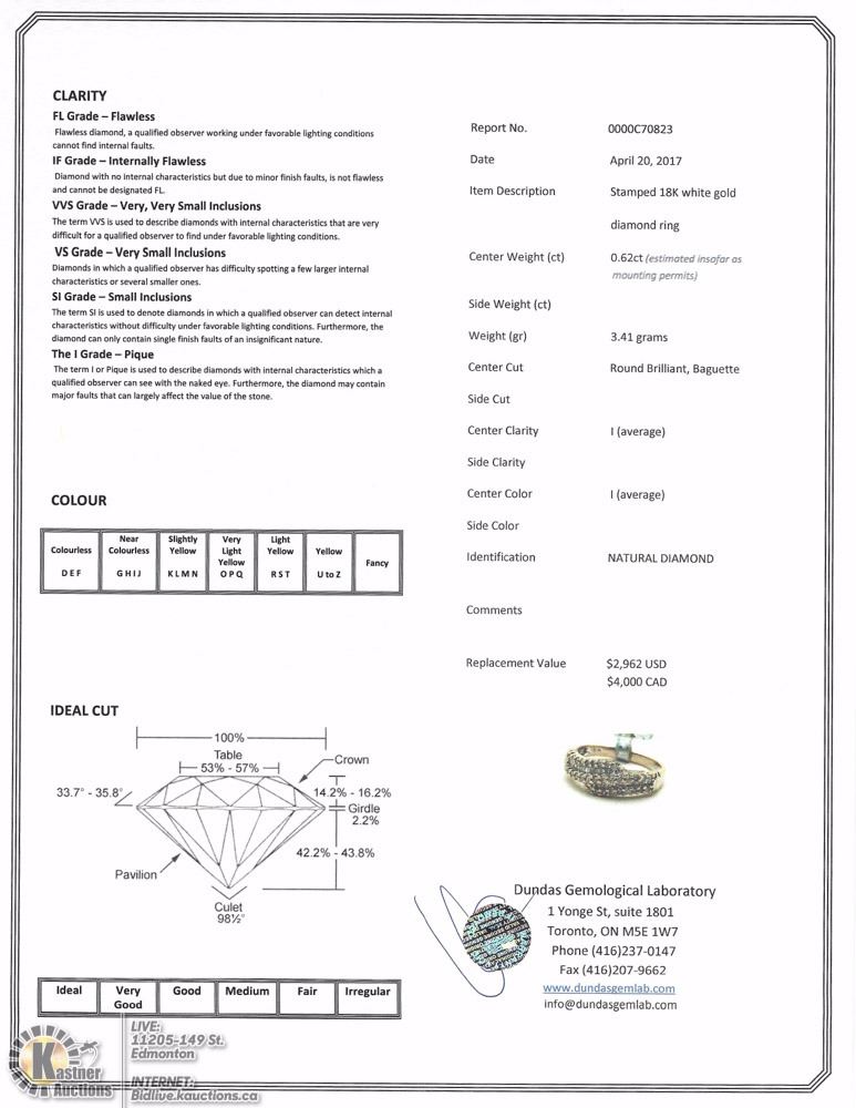 ITEM#36 - AC3: 18K WHITE GOLD DIAMOND(0.62CT) RING SIZE:7 W/ COA - SUGGESTED REPLACEMENT VALUE $4,000.00