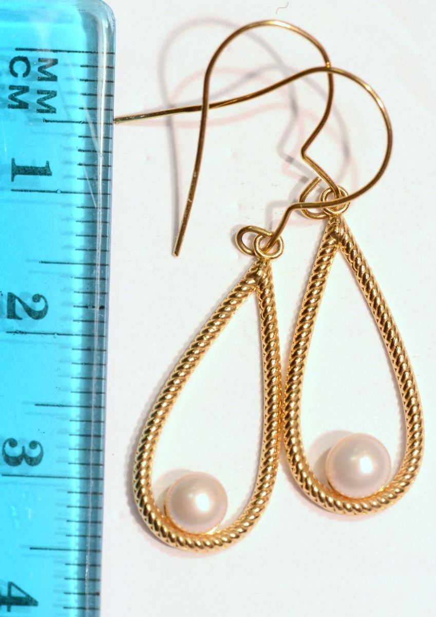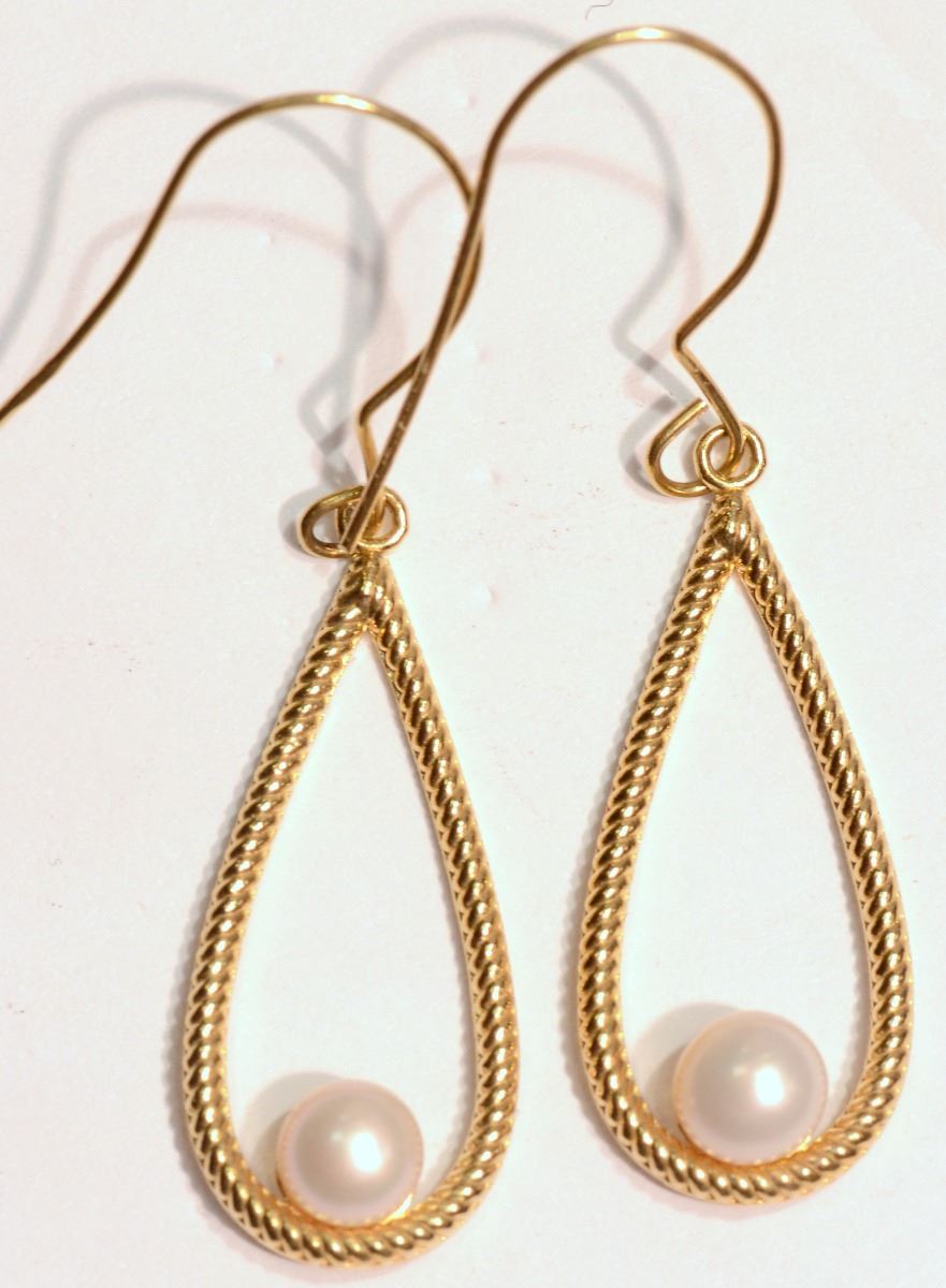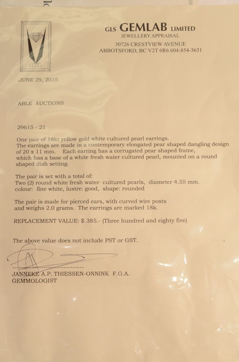 YELLOW GOLD EARRINGS WITH 2 FRESHWATER WHITE PEARLS SET AT THE BOTTOM OF A TEXTURED TEARDROP SETTING - SUGGESTED REPLACEMENT VALUE $385.00