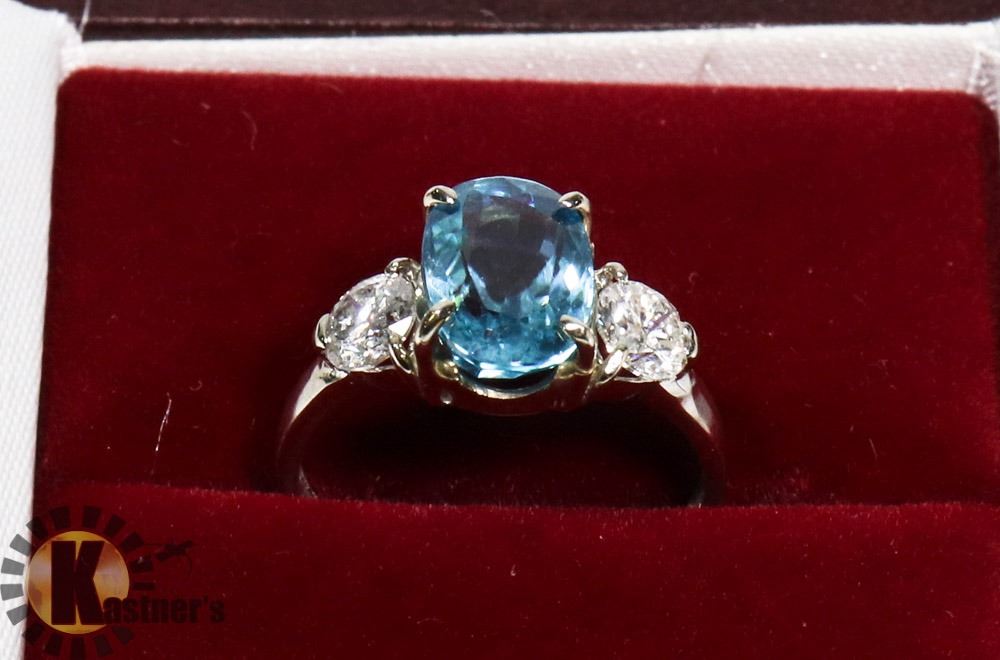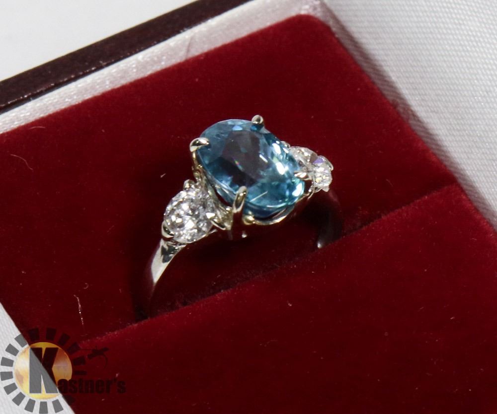 SIZE 7, ONE OVAL SHAPED NATURAL BLUE ZIRCON (MEASURING 10.61 - 7.20 X 5.50MM, TONE MEDIUM, HUE SLIGHTLY GREENISH/BLUE, CLARITY GRADE SI-1, CUT GRADE FAIR, WEIGHS 5.50 CARATS), TWO ROUND BRILLIANT CUT DIAMONDS (MEASURING 4.65 - 4.66MM,CLARITY GRADE I-3, COLOR GRADE G-H, WEIGHS 0.70MM). COMES WITH CERTIFICATE OF APPRAISAL FROM LOCAL APPRAISER, SUGGESTED INSURANCE COVERAGE $3,300.00. JEWELLERY