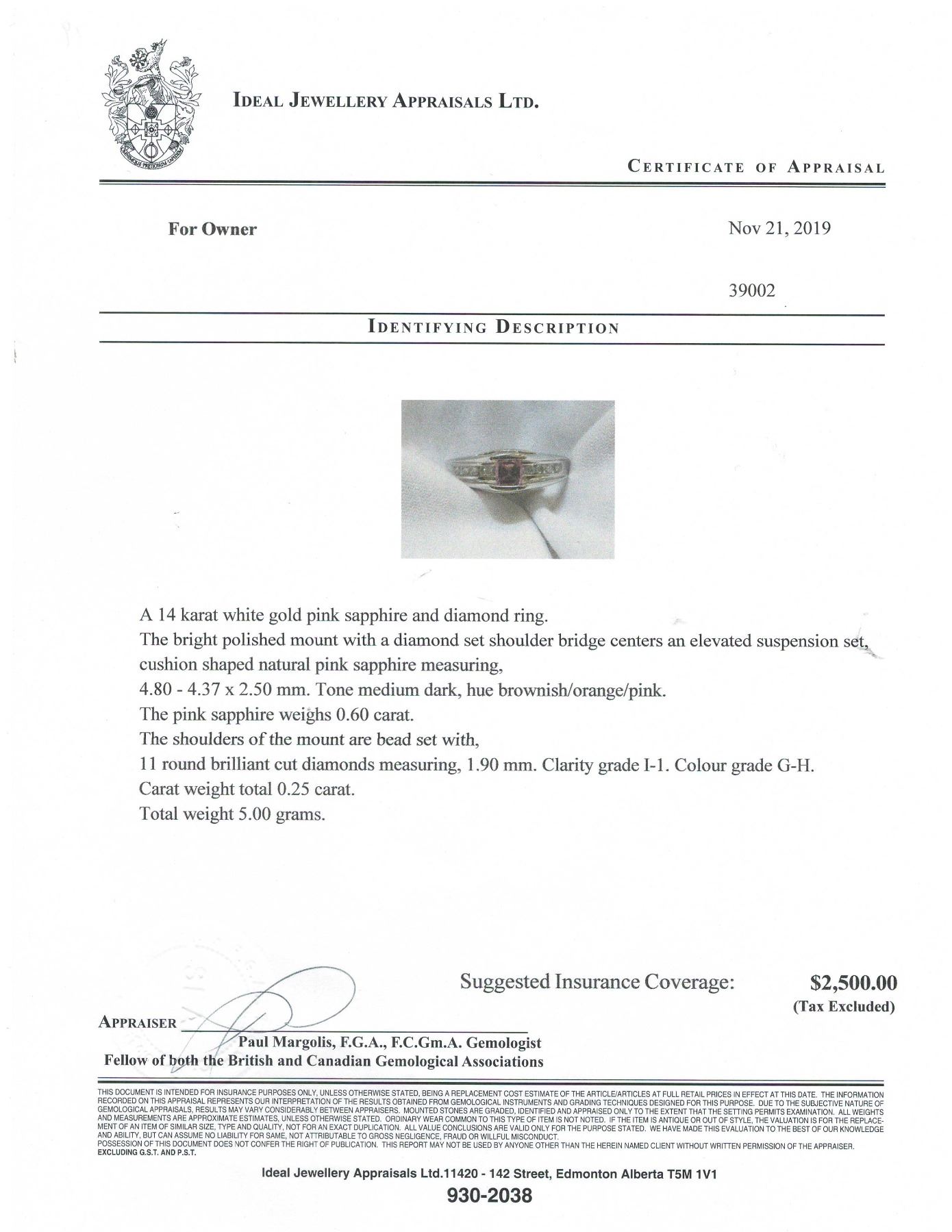 SIZE 7 WITH LOCAL APPRAISAL, PINK SAPPIHRE CARAT WEIGHT 0.60 CARATS, 11 ROUND BRILLIANT CUT DIAMONDS, CALRITY GRADE I-1, COLOR GRADE G-H, DIAMOND CARAT WEIGHT 0.25 CARATS, TOTAL WEIGHT 5.00 GRAMS. SUGGESTED INSURANCE COVERAGE$2,500.00. JEWELLERY