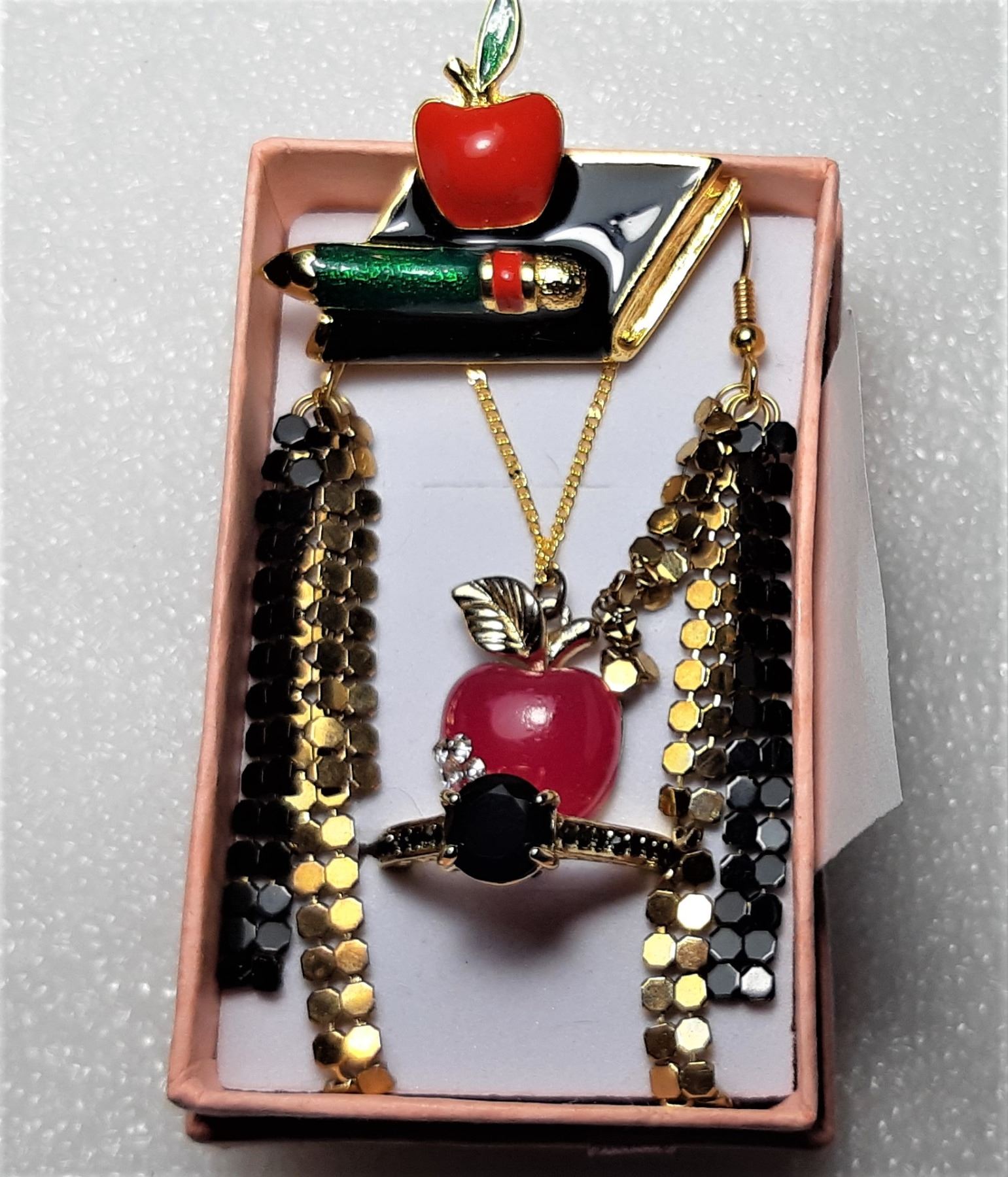 ENAMEL TEACHER'S BROOCH, RED APPLE WITH CRYSTAL ACCENTS PENDANT ON 16" CHAIN, BLACK & GOLD TONE FLAT CHAIN STYLE EARRINGS AND SIZE 9 BLACK SAPPHIRE RING. JEWELRY
