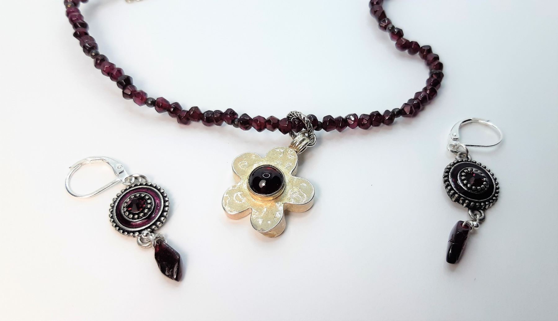 SILVER FLOWER PENDANT WITH ROUND CABACHON CENTRE STONE AND DROP EARRING. JEWELRY