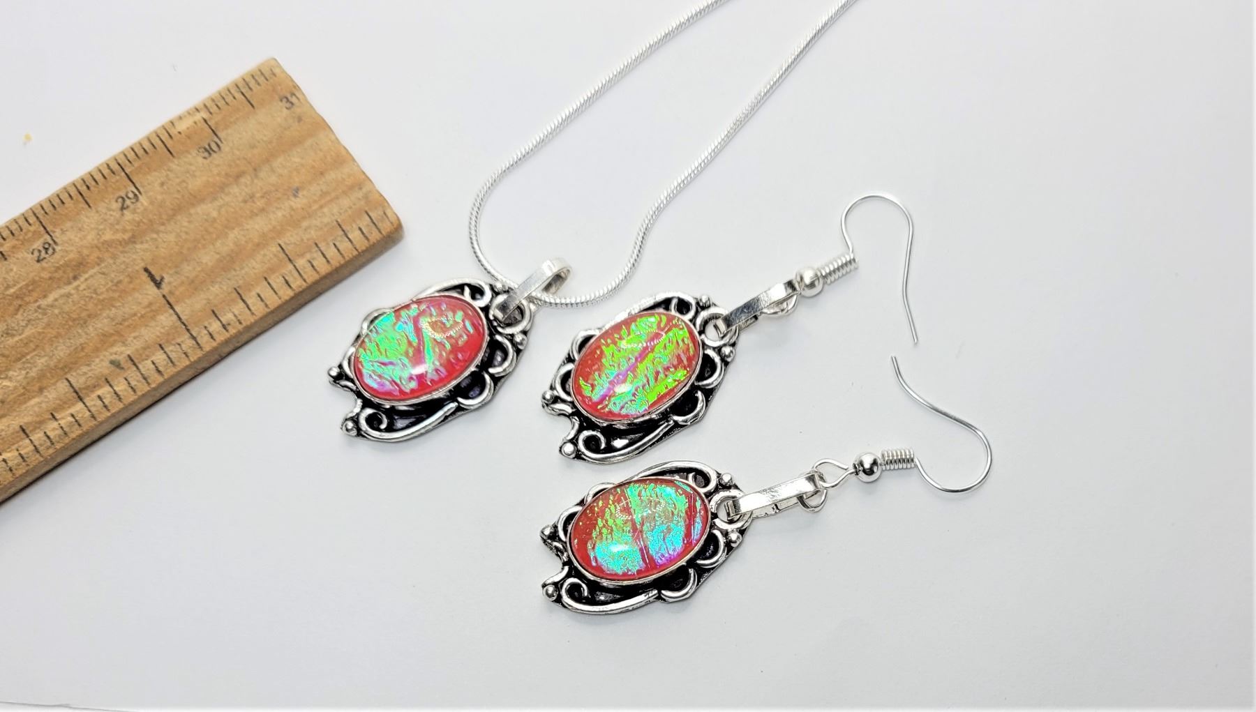 AUSTRALIAN FIRE OPALS, INCLUDES OVAL DROP EARRING AND NECKLACE ON AN 18" SNAKE CHAIN. JEWELRY