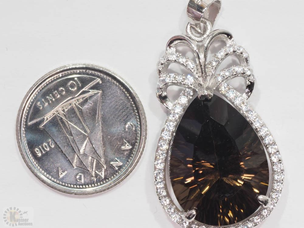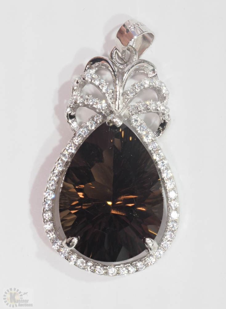 STERLING SILVER LARGE SMOKEY QUARTZ(10.0CT) & CUBIC CRYSTALS PENDANT W/ COA - SUGGESTED REPLACEMENT VALUE $500.00