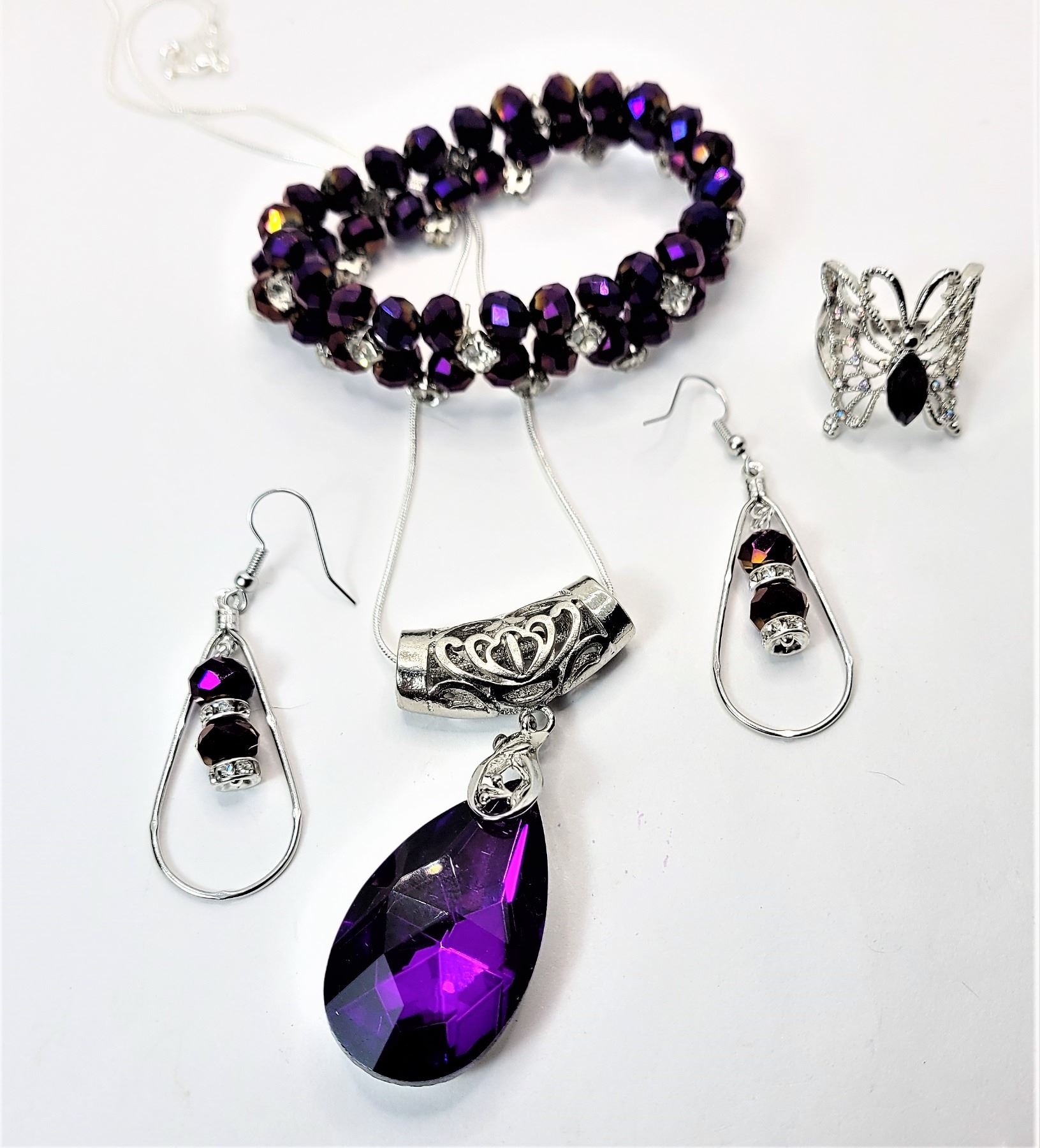 BRACELET WITH CLEAR CRYSTAL ACCENTS, DROP EARRINGS ON NICKLE FREE FISH HOOK WIRES, TEARDROP PENDANT ON 18" SNAKE CHAIN AND LAB CREATED AMETHYST BUTTERFLY RING WITH RAINBOW CRYSTAL ACCENTS, SIZE 8.***ITEM(S) LOCATED IN LETHBRIDGE ALBERTA