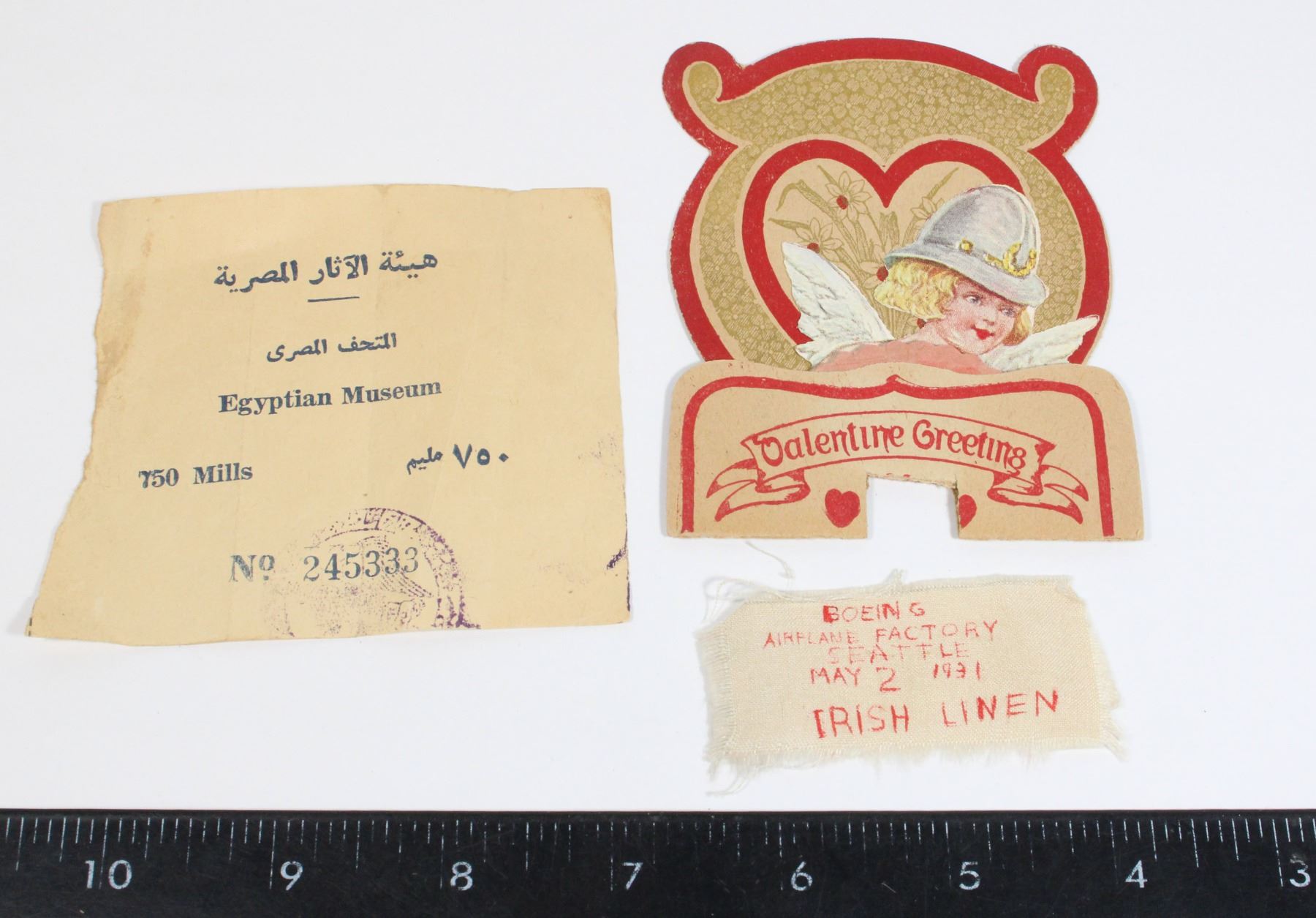 BOEING AIRPLANE FACTORY MAY 2 1931 SOUVENIR, AND ANTIQUE EGYPTIAN MUSEUM TICKET + STAMP EGYPT NUMBERED 245333 EARLY 20TH CENTURY EGYPTIAN MUSEUM TICKET EPHEMERA