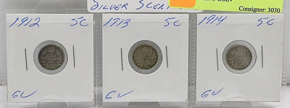 1912,13,14 SET OF 3 CANADIAN GV SILVER 5 CENT COIN