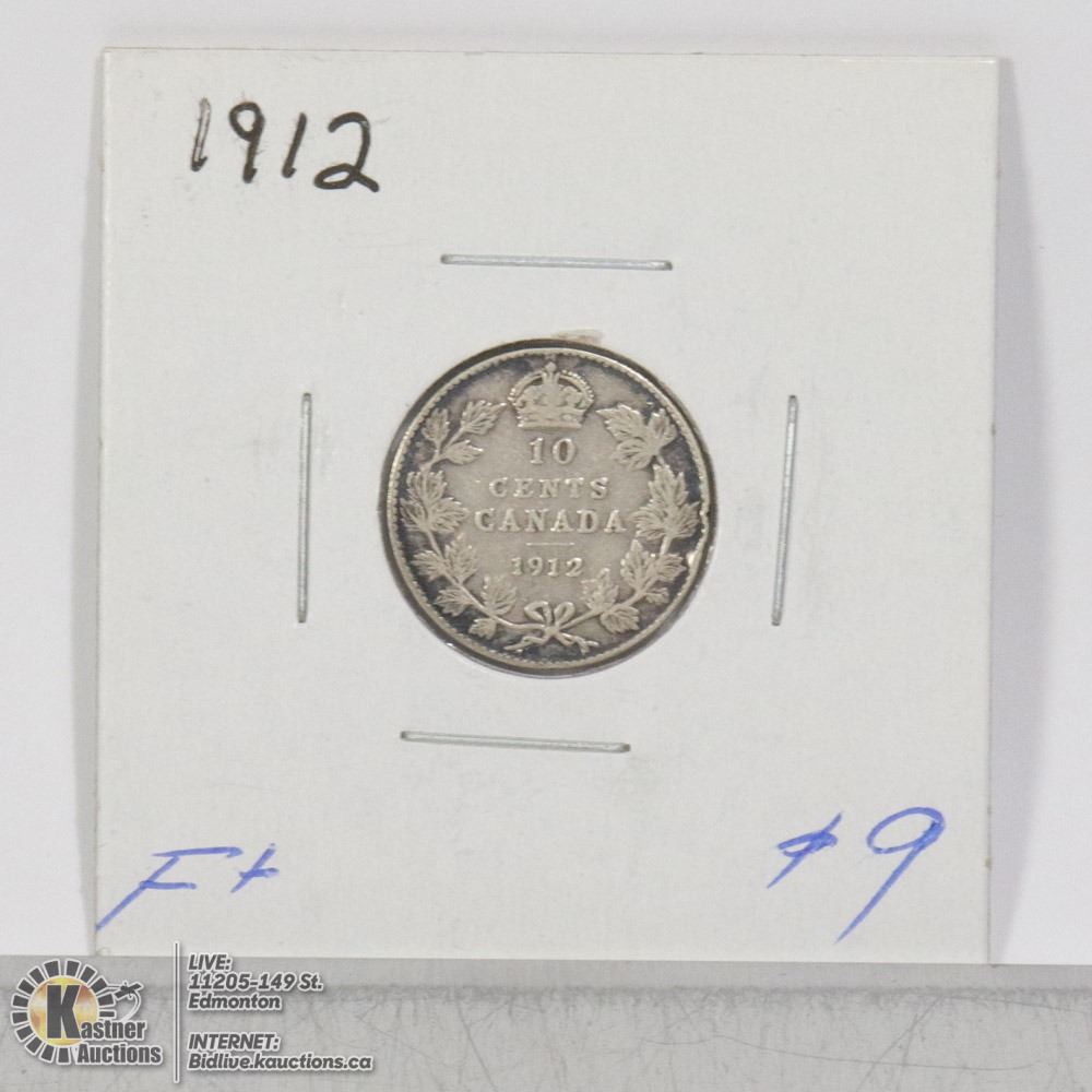 1912 CANADIAN 10 CENT SILVER COIN- F+