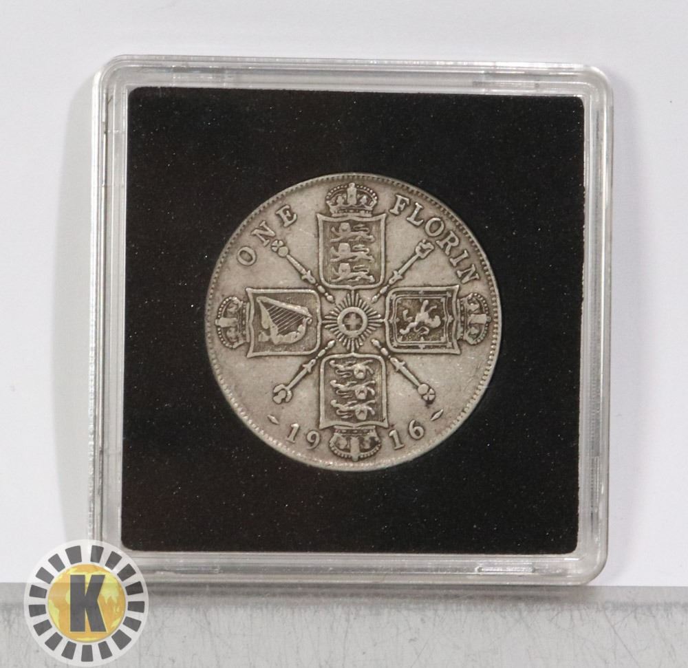 LARGE BRITISH SILVER 1 FLORIN FROM 1916. CHOICE EXAMPLE WITH STUNNING DETAIL AND ORIGINAL TONE. GREAT EYE APPEAL. ***ITEM LOCATED IN LETHBRIDGE AB