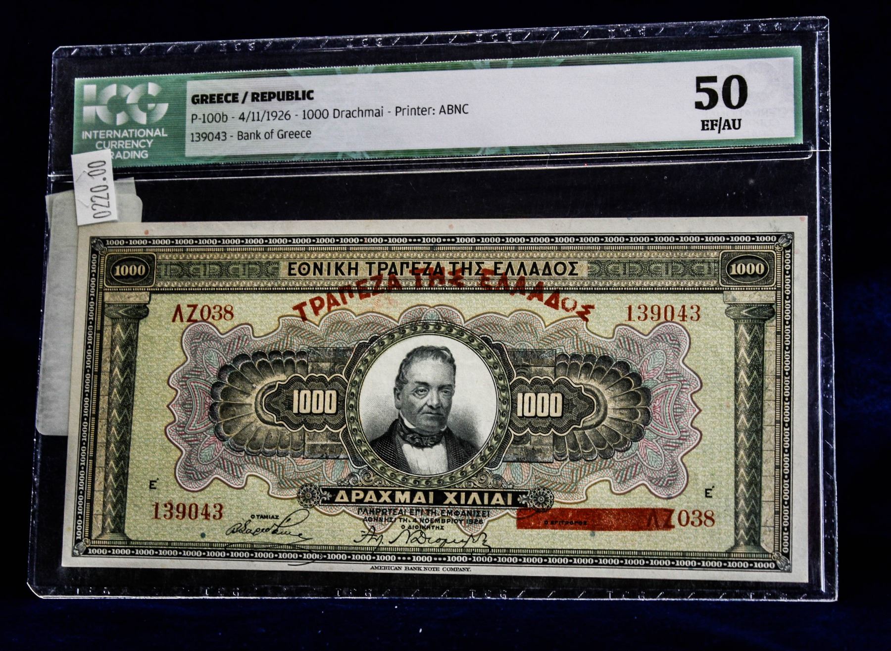 1926 GREECE 1000 DRACHMA NOTE ICG AU50
