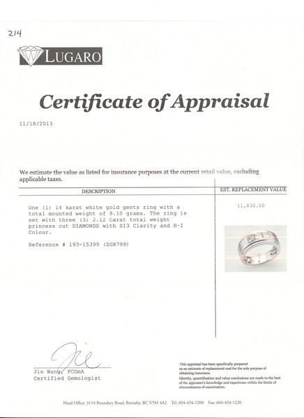 3=2.12cts. T.W. PRINCESS CUT DIAMONDS, SI3 CLARITY, H/I COLOR, APPRAISAL, RETAIL VALUE $11,830.00