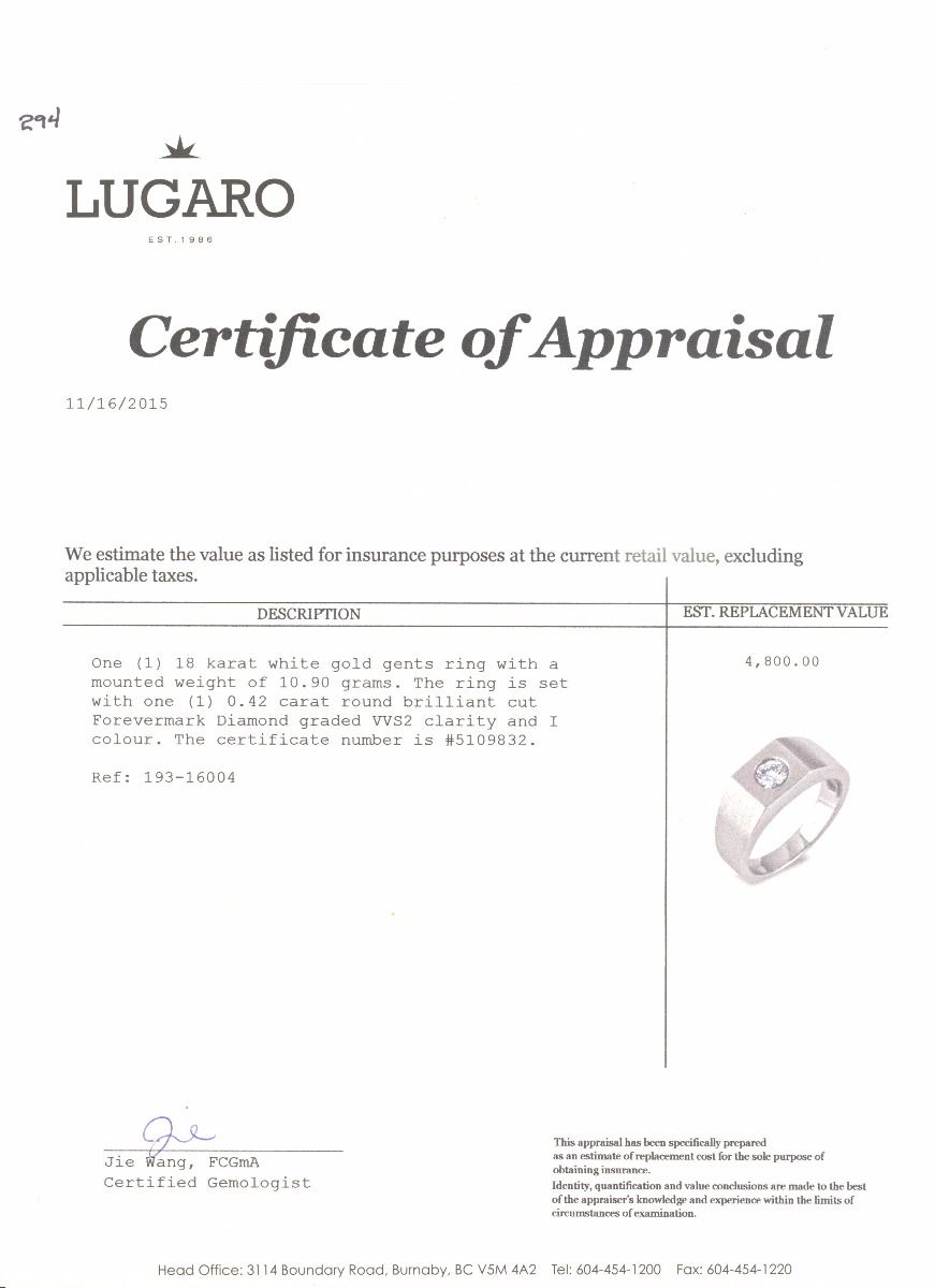 1=.42 cts Forevermark round brilliant cut diamond, VVS2 clarity, I color, Forevermark cert and appraisal. Size 10 3/4. RETAIL VALUE $4,800.00