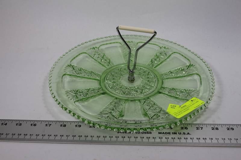 1930s GREEN PRESSED GLASS CAKE PLATE W/ HANDLE